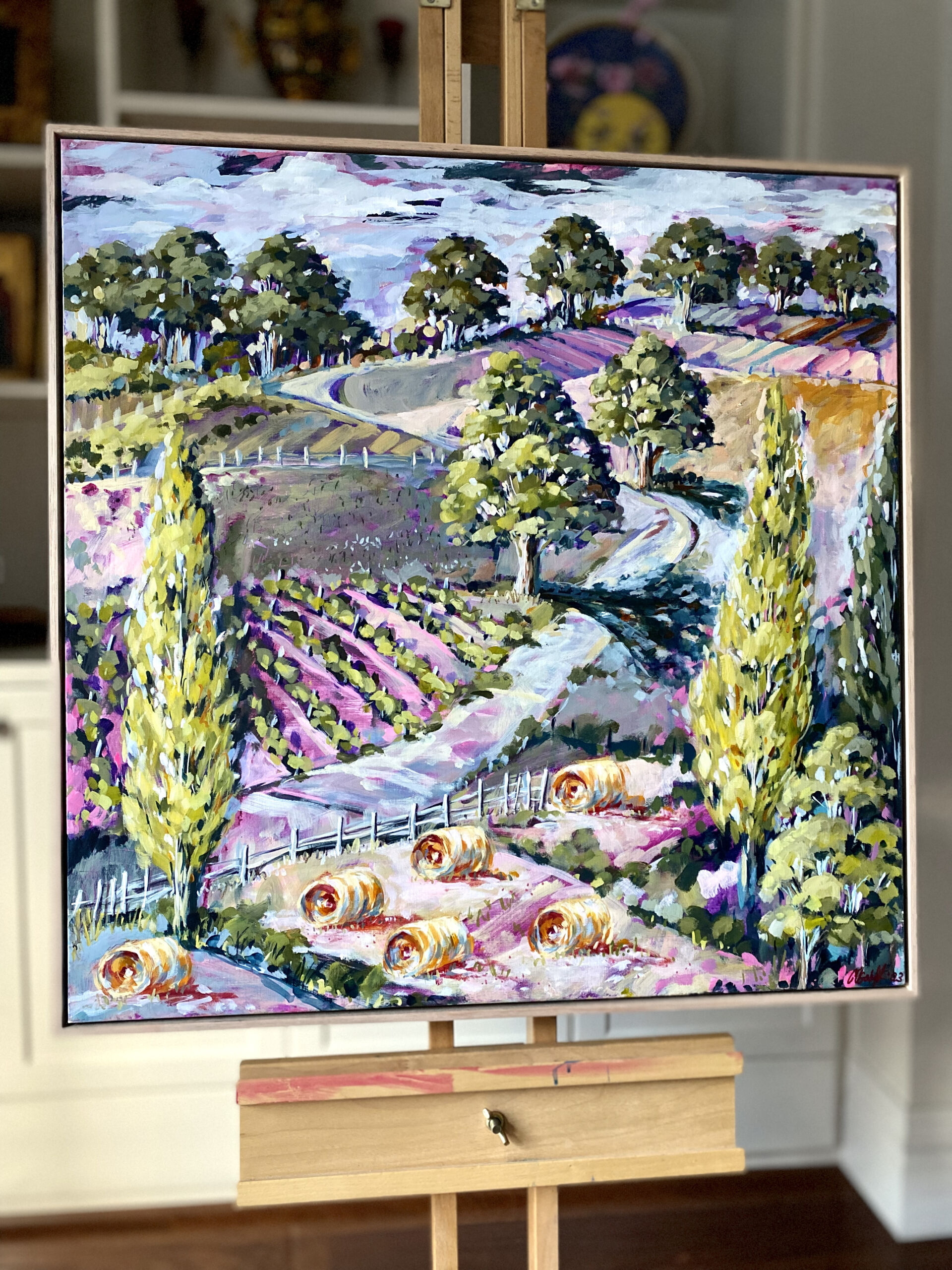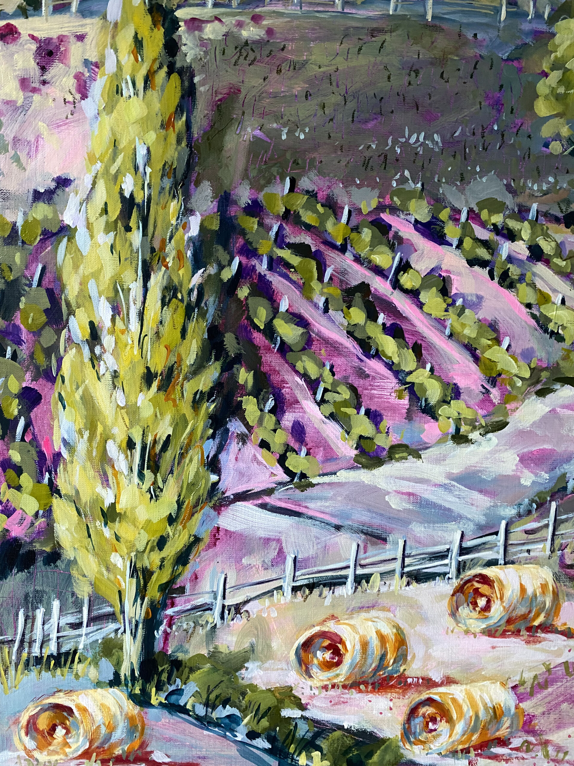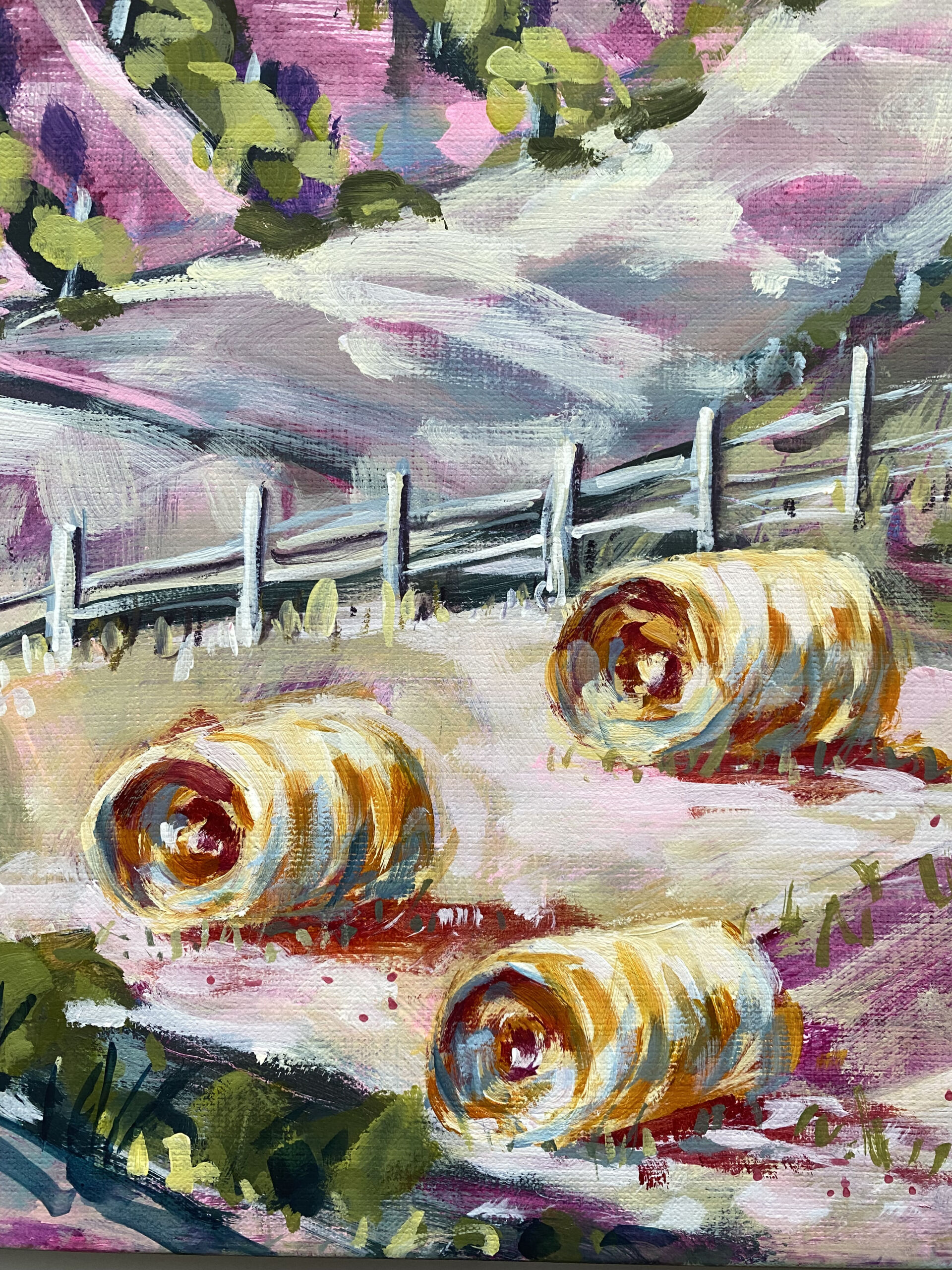 This work transports the viewer to a typical view of a picturesque property inviting you to wander along a quaint back road lined with such trees. Soft golden hay bales in the foreground add nostalgic charm to the rural setting creating a contrast against the green fields and trees.