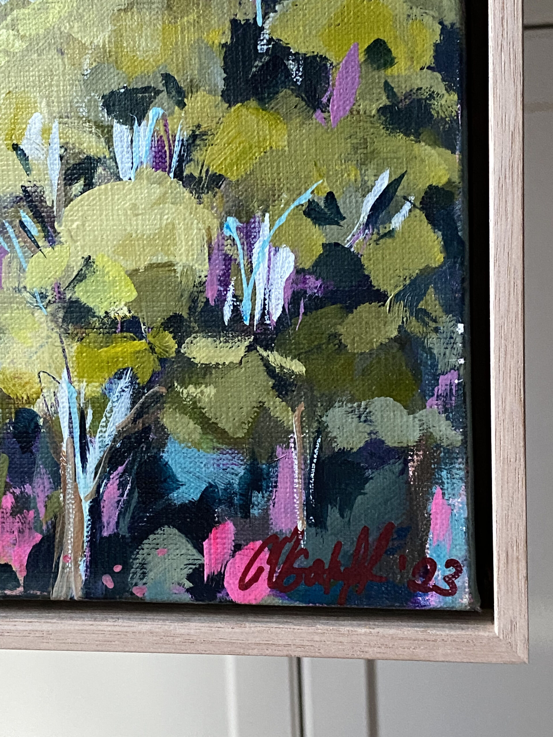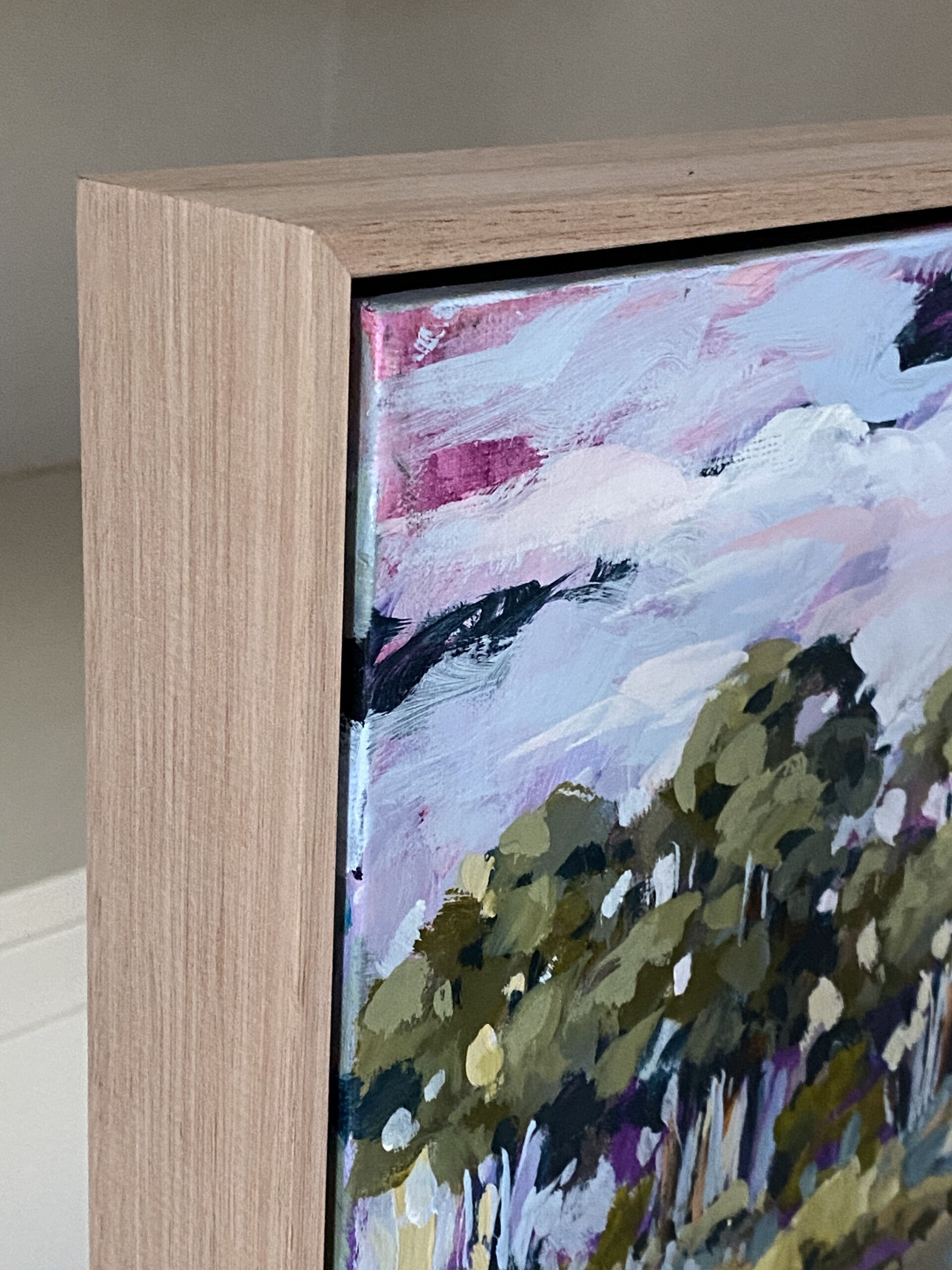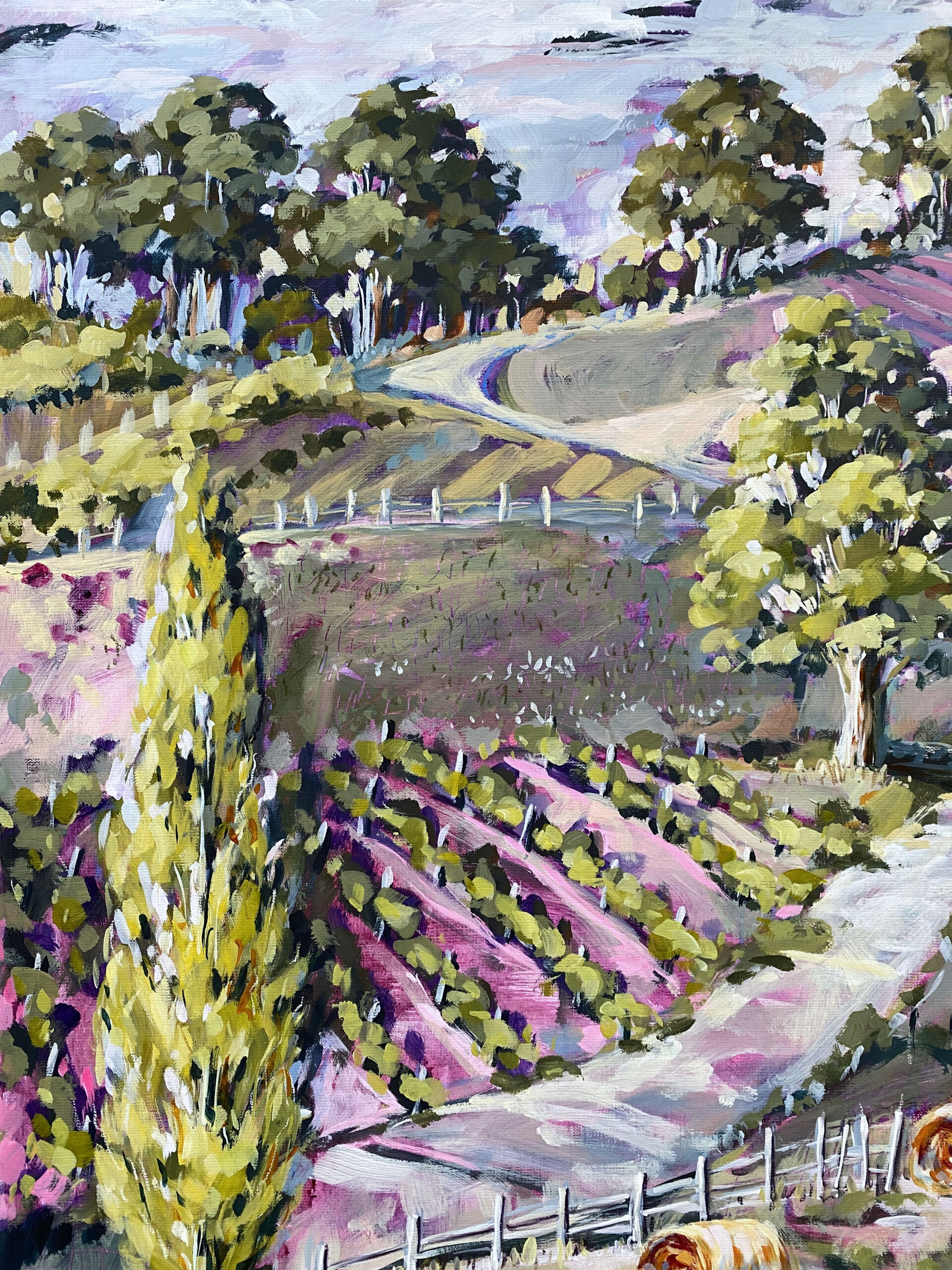 This work transports the viewer to a typical view of a picturesque property inviting you to wander along a quaint back road lined with such trees. Soft golden hay bales in the foreground add nostalgic charm to the rural setting creating a contrast against the green fields and trees.