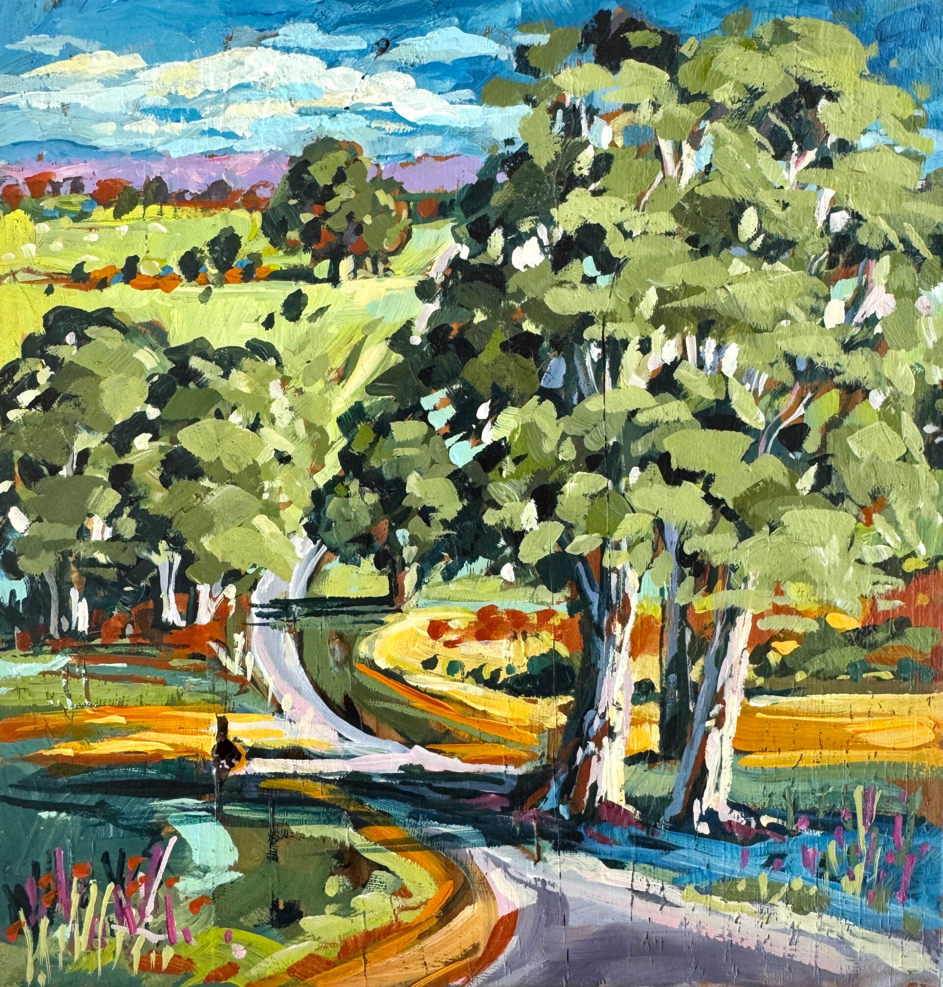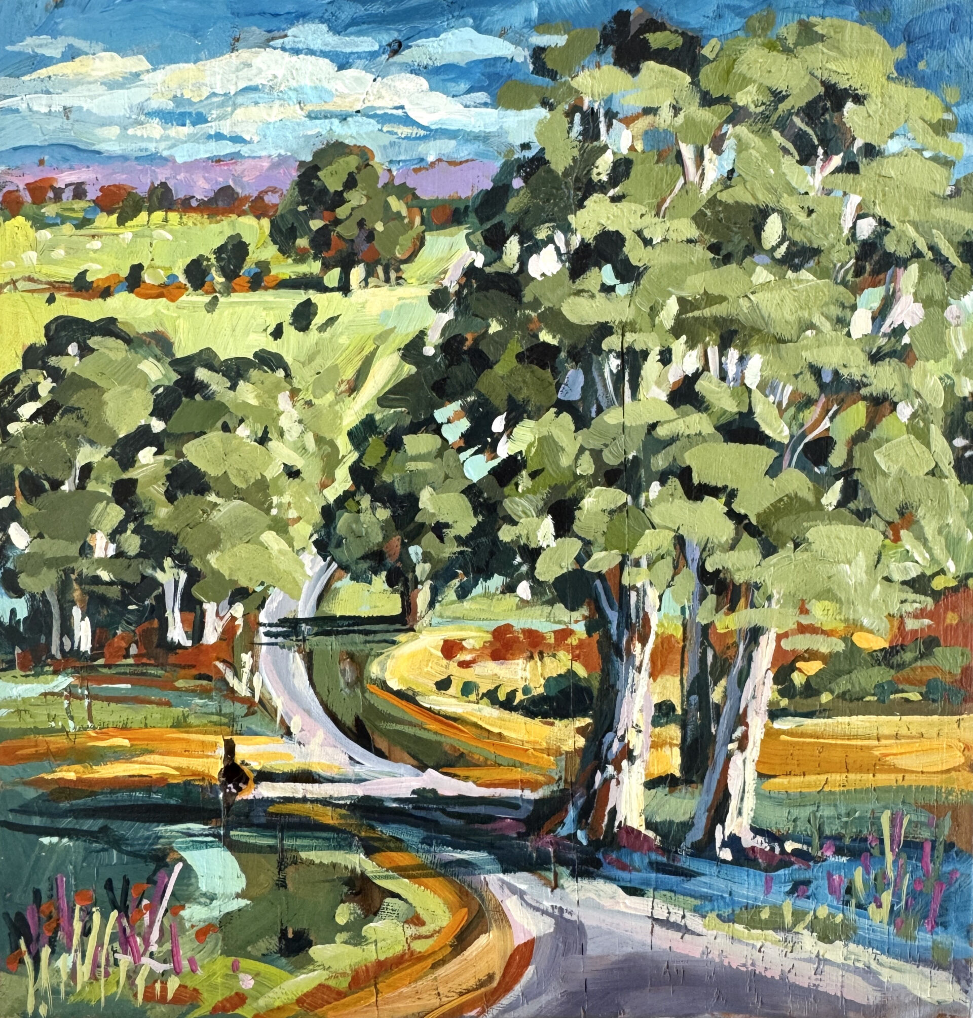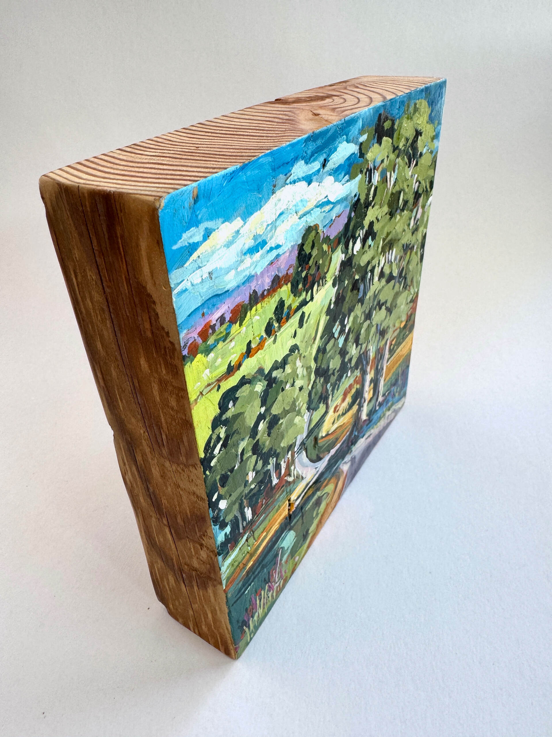 Country Road Gums - acrylic on reclaimed wood block painting by artist Cathy Usatoff