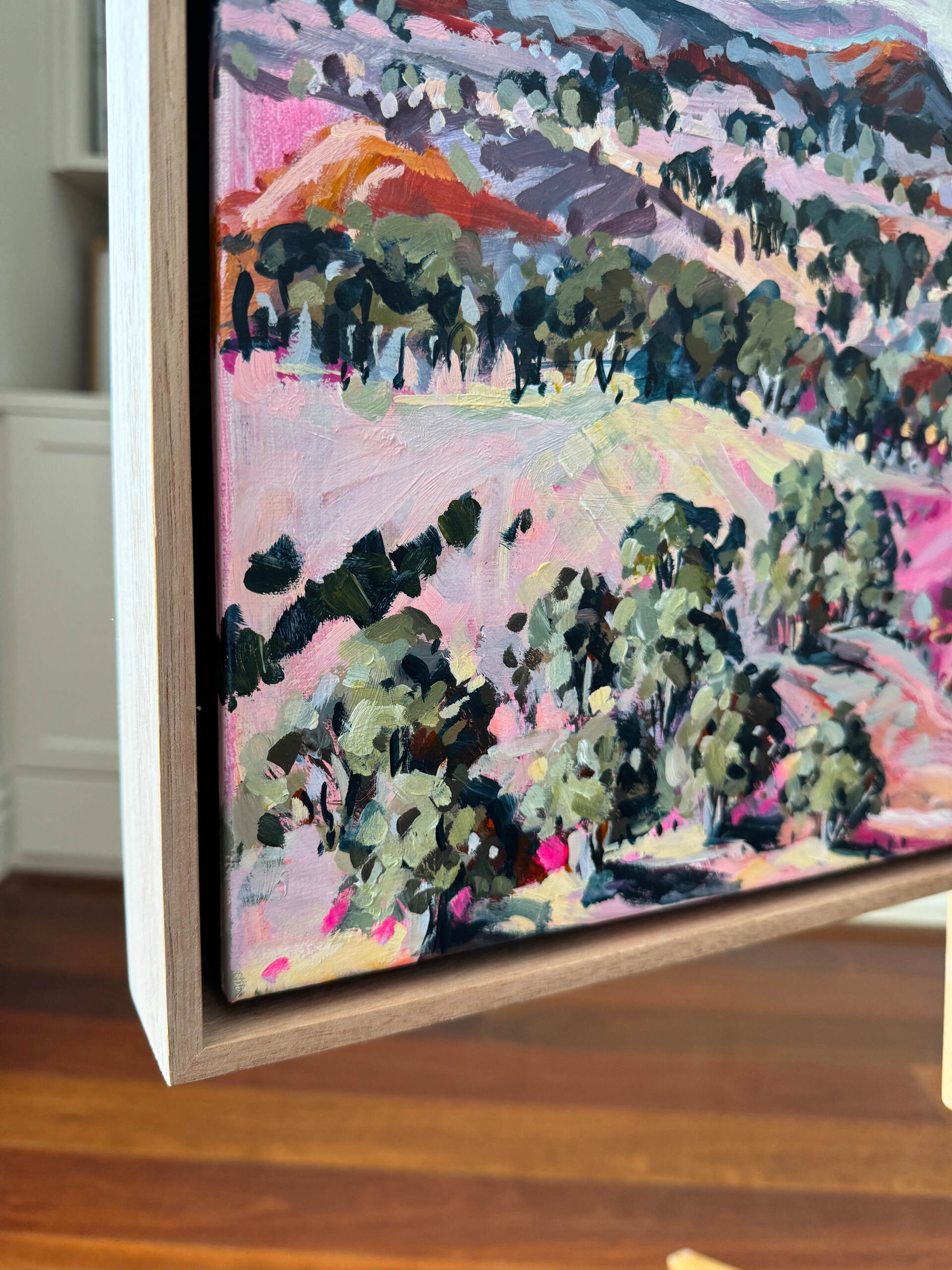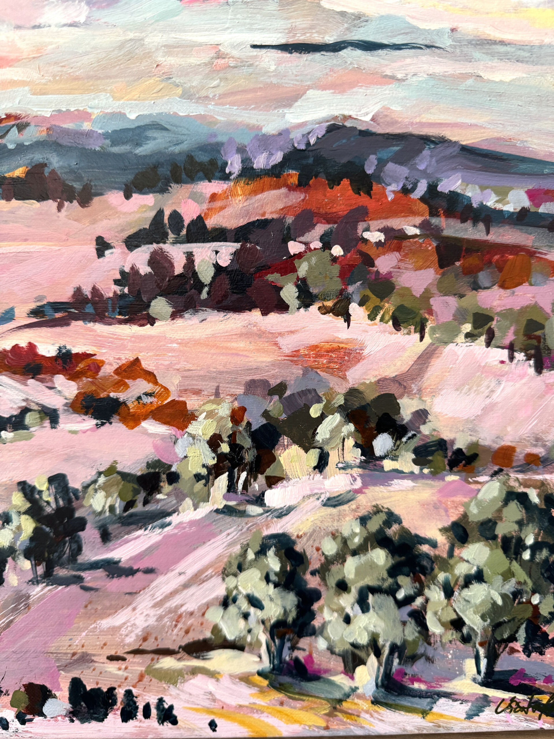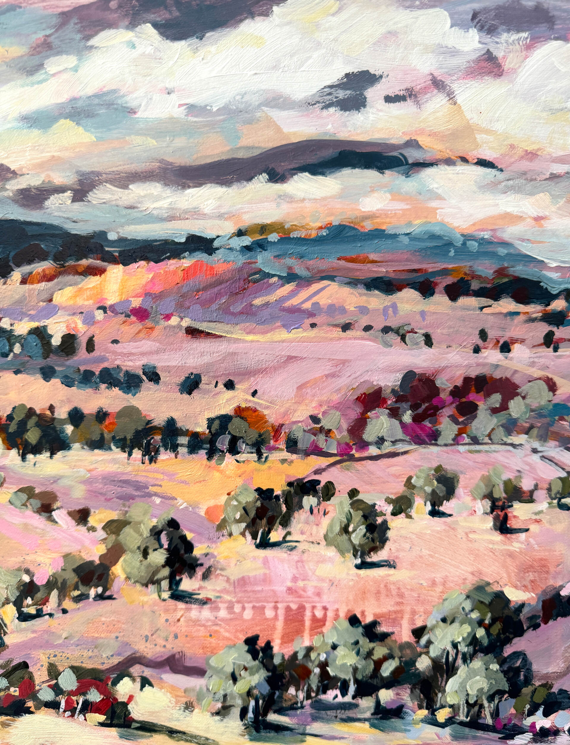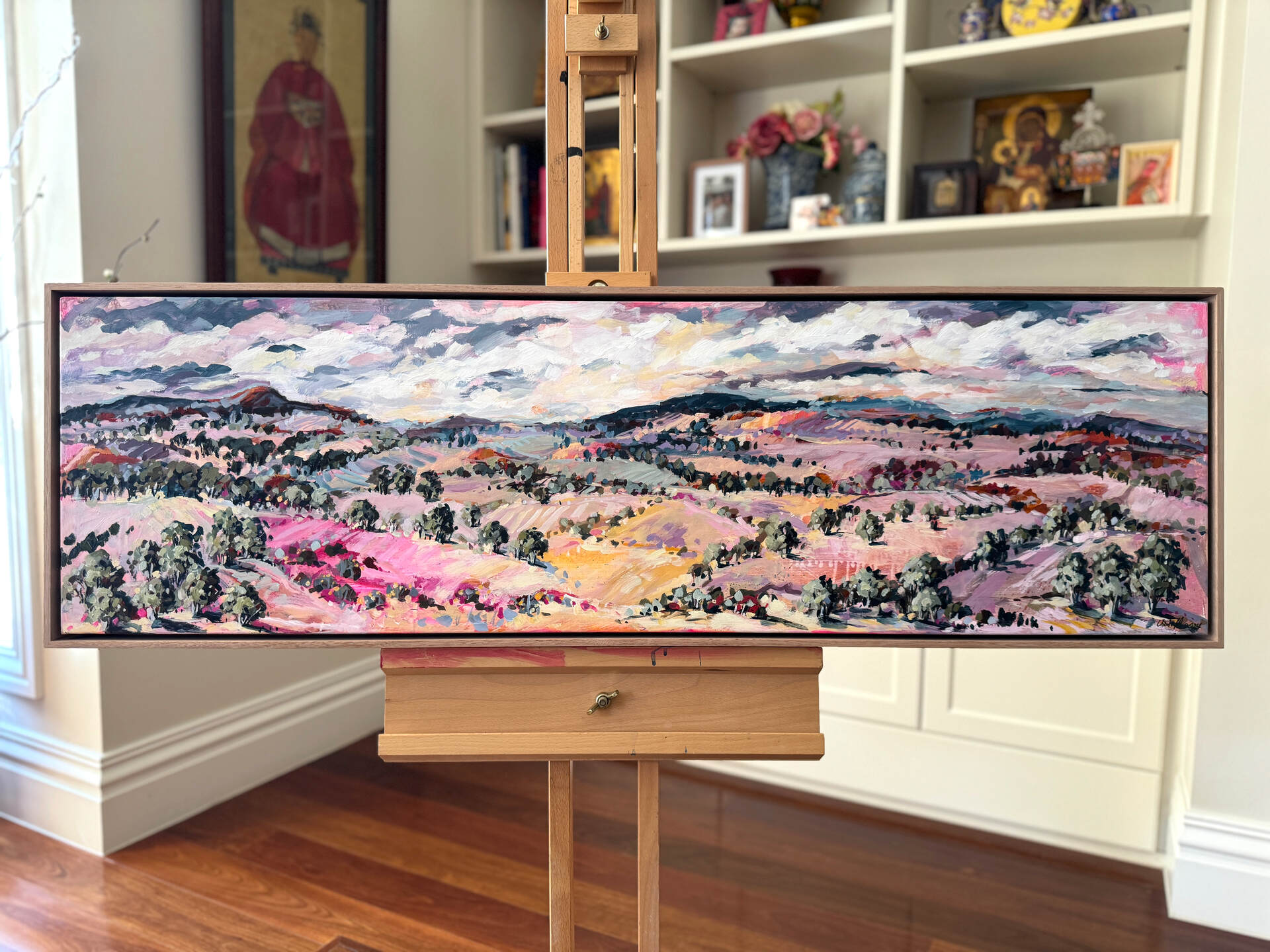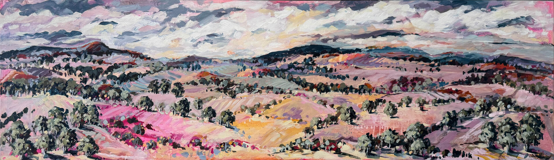 This painting was inspired by one of my trips to Central Australia focusing on the soft pink colours that can be seen along the West McDonnell Ranges. This long horizontal format is a favourite of mine. Ideally placed above a sideboard or bedhead.