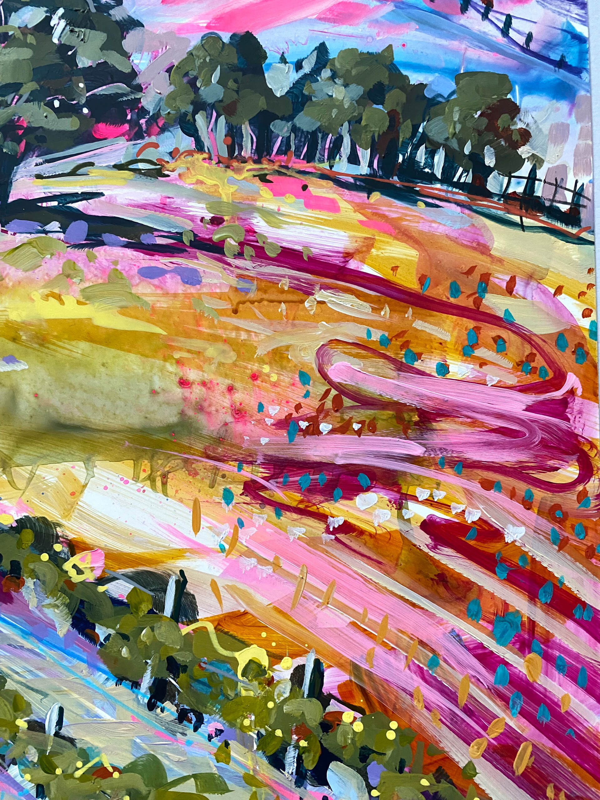 Horizons and Hues of Red Hill H2 - Acrylic, pencils, Posca pens on Yupo paper by artist Cathy Usatoff