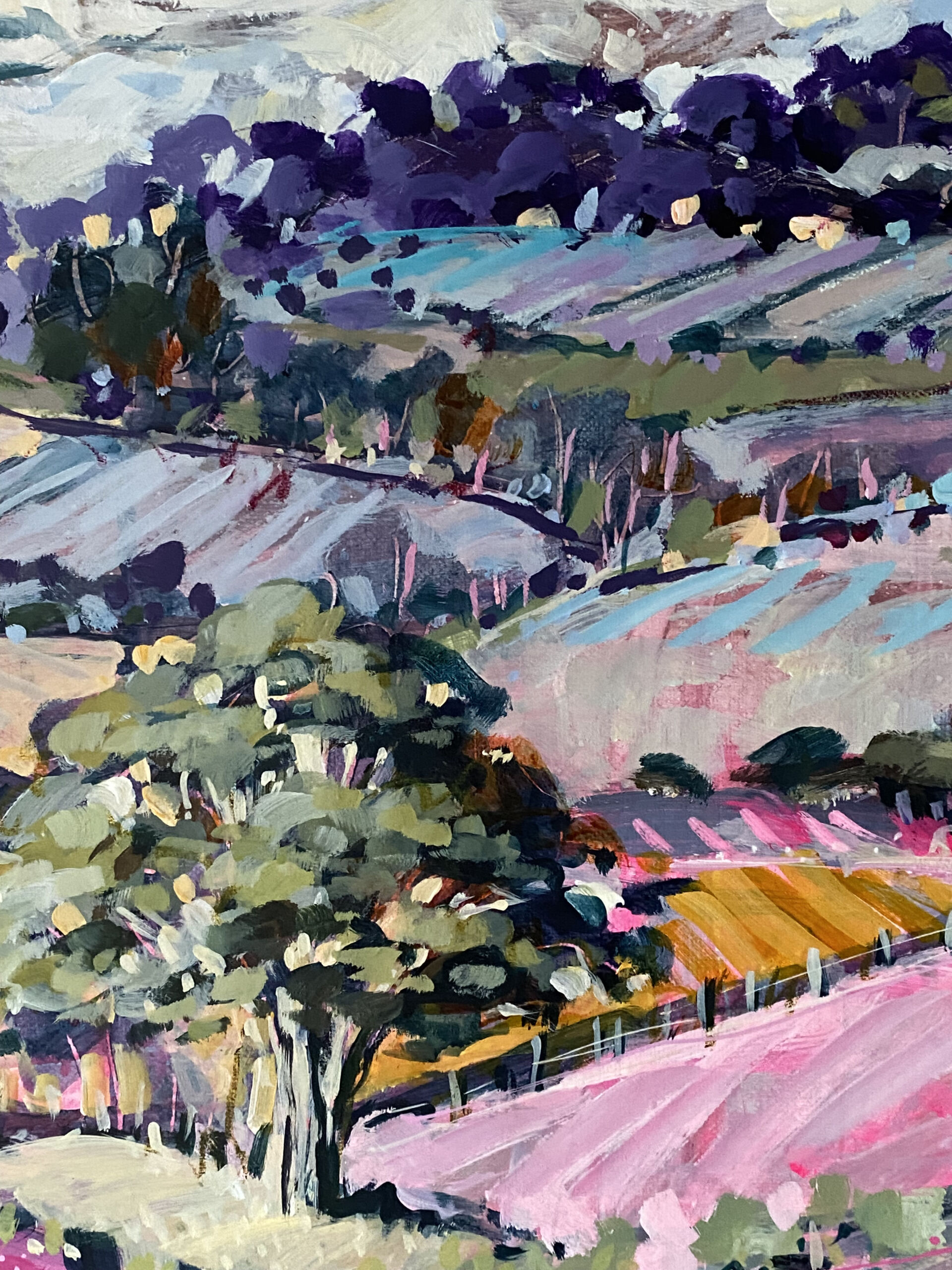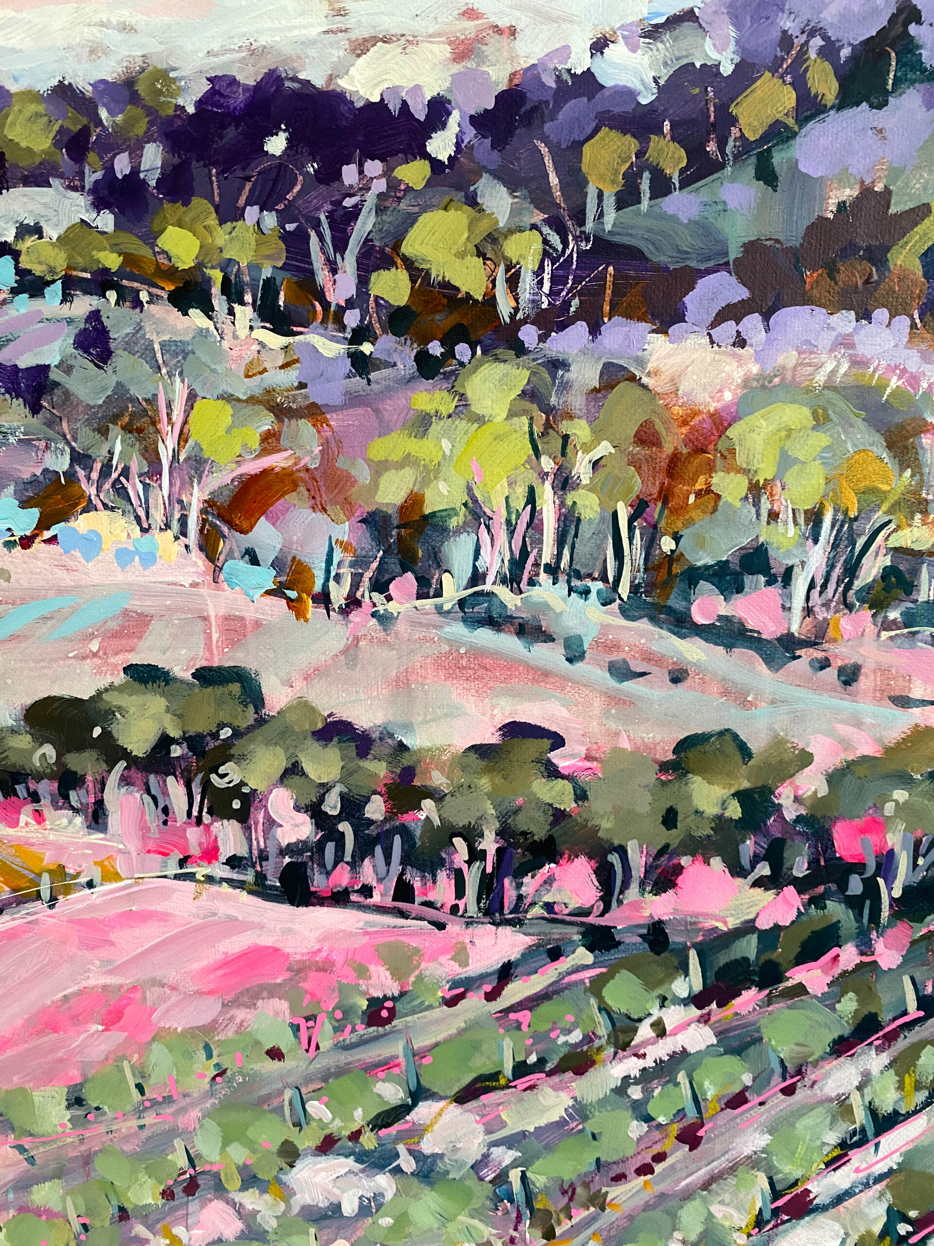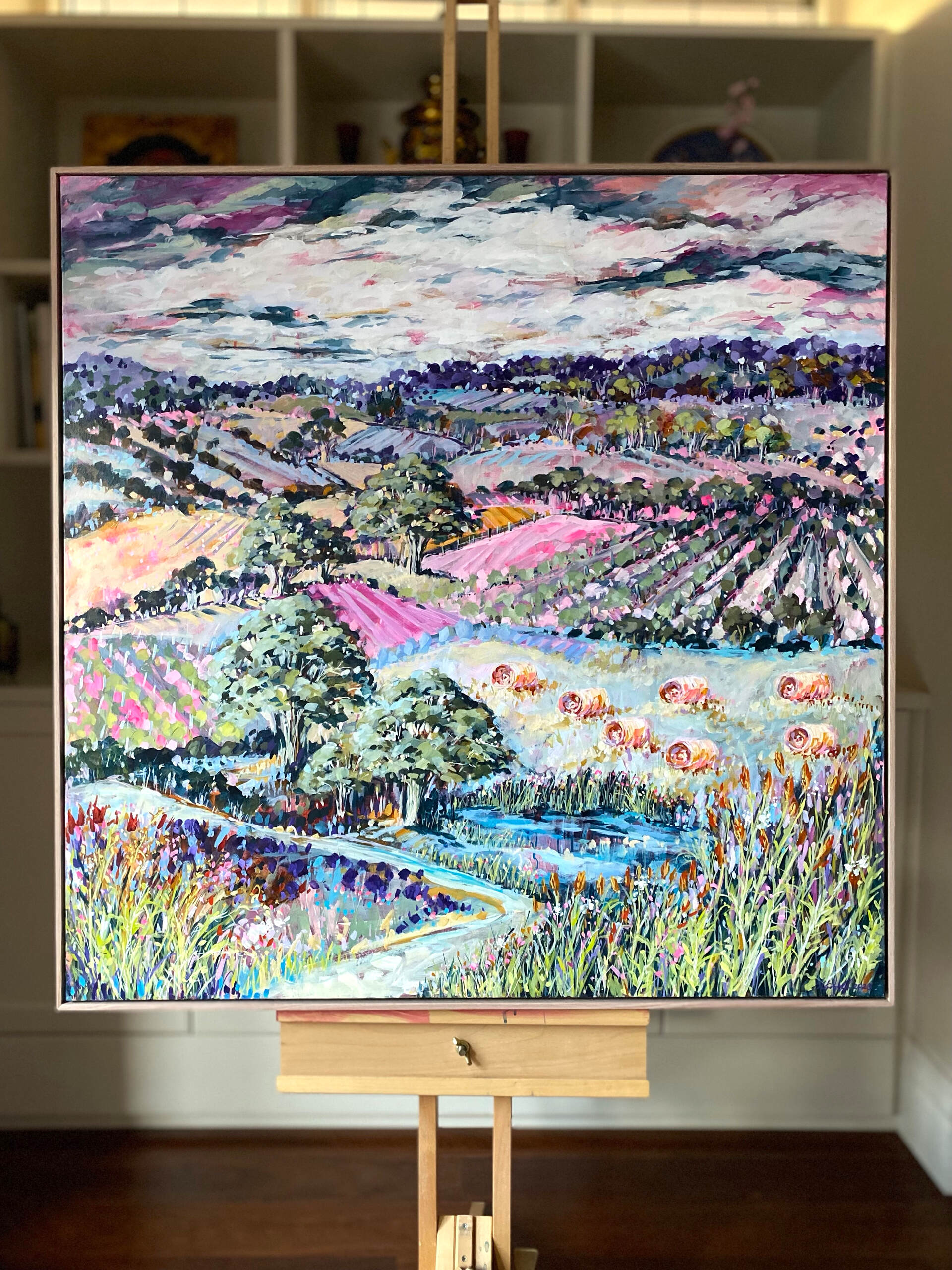 Inspired by the bountiful aspects of rural life and scenic hills and wineries on the Mornington Peninsula, this work is an impressionistic portrayal of the charm of rural Victoria and the Australian Landscape. Harmonious fusion of pastel pinks, lavenders, and soft greens gently wash over the hills and meadows evoking a tranquil and idyllic landscape.
