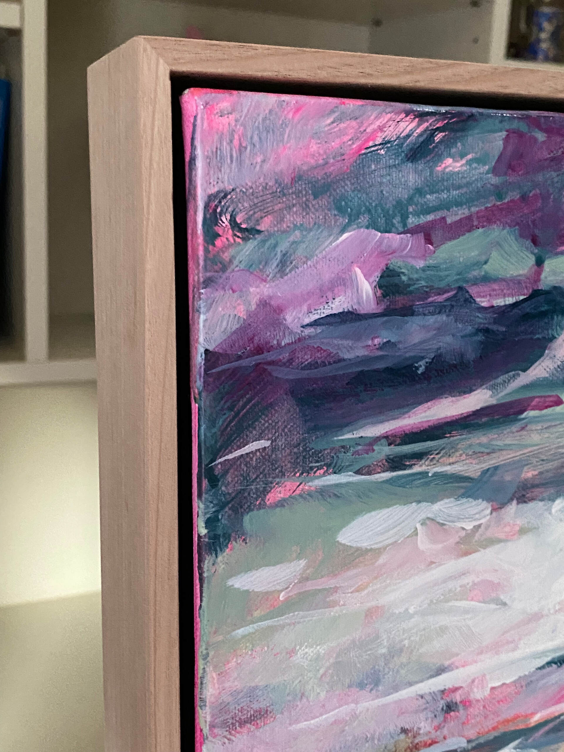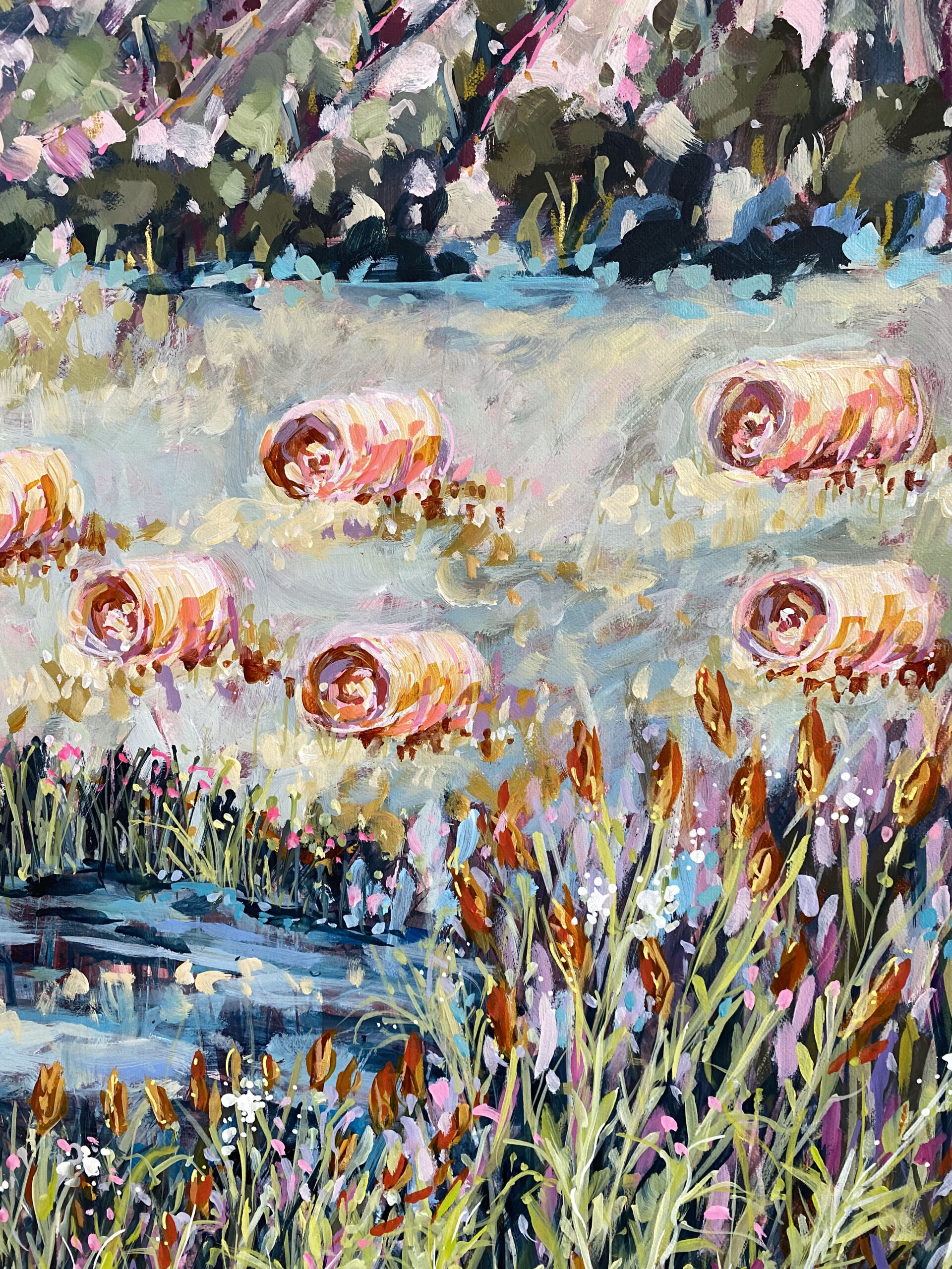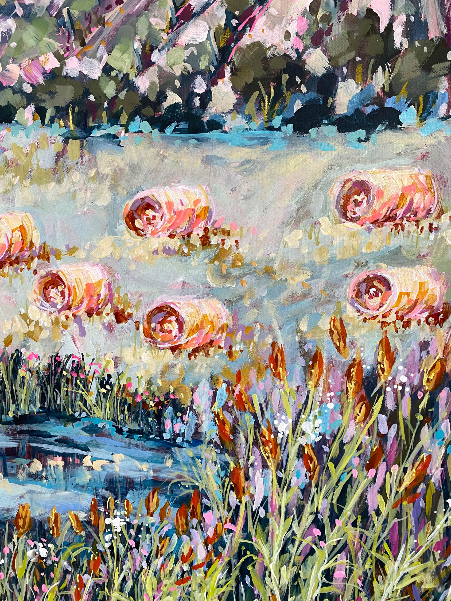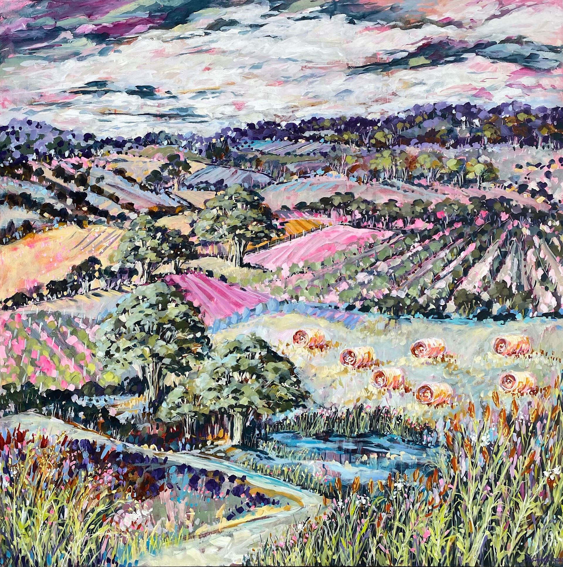 Inspired by the bountiful aspects of rural life and scenic hills and wineries on the Mornington Peninsula, this work is an impressionistic portrayal of the charm of rural Victoria and the Australian Landscape. Harmonious fusion of pastel pinks, lavenders, and soft greens gently wash over the hills and meadows evoking a tranquil and idyllic landscape.