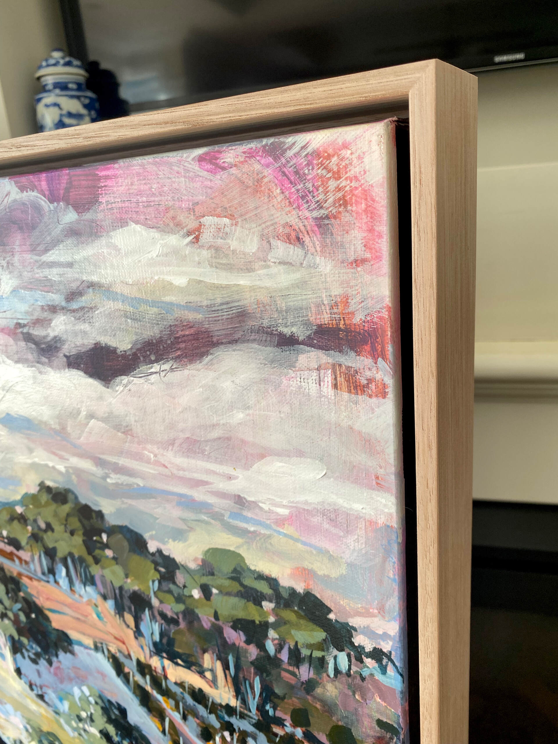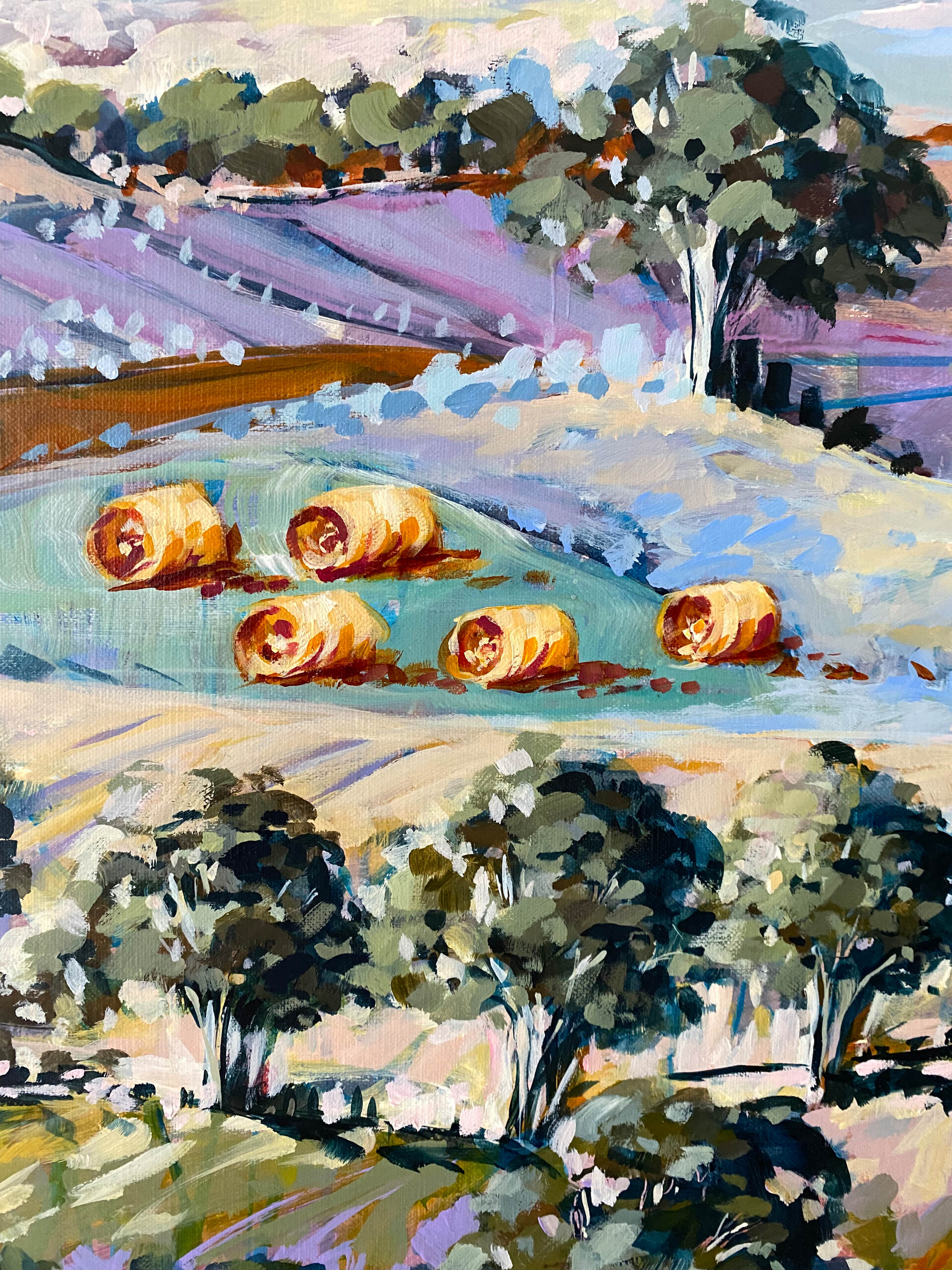 Inspired by the bountiful aspects of rural life and scenic hills and wineries on the Mornington Peninsula, this work invites you into the idyllic scene of rolling hills, scattered trees, hay bales and vineyards that stretch into the distance.