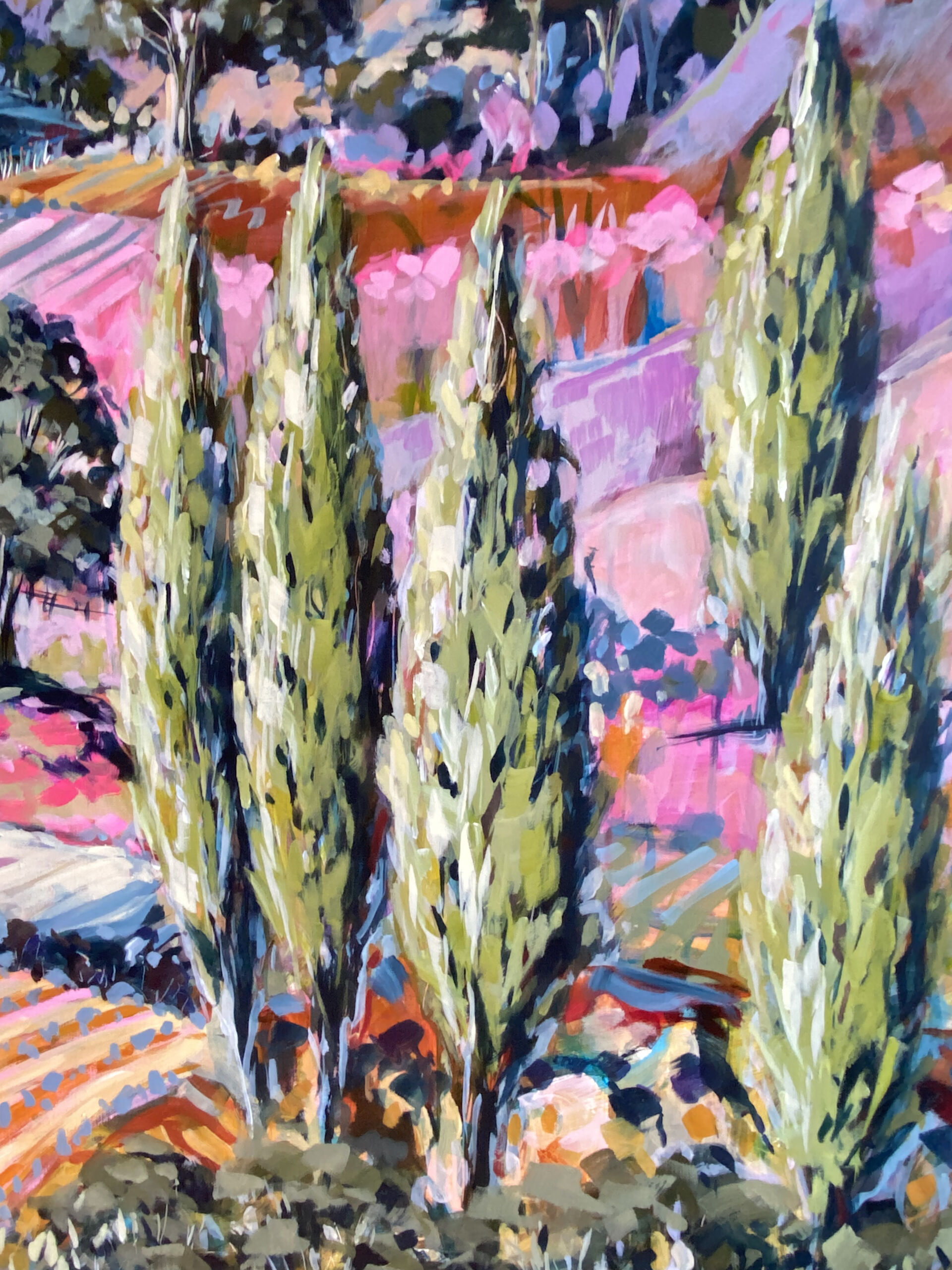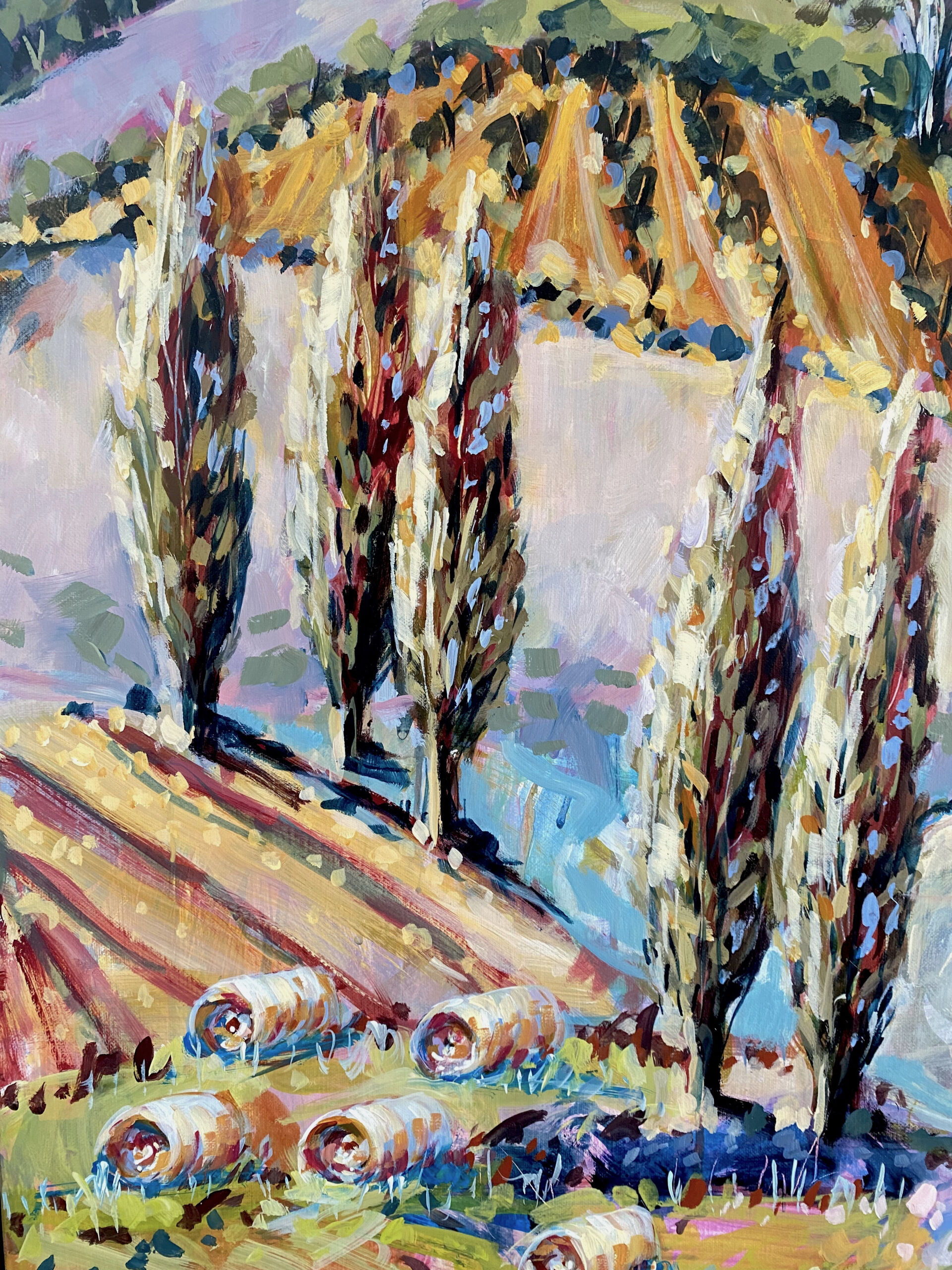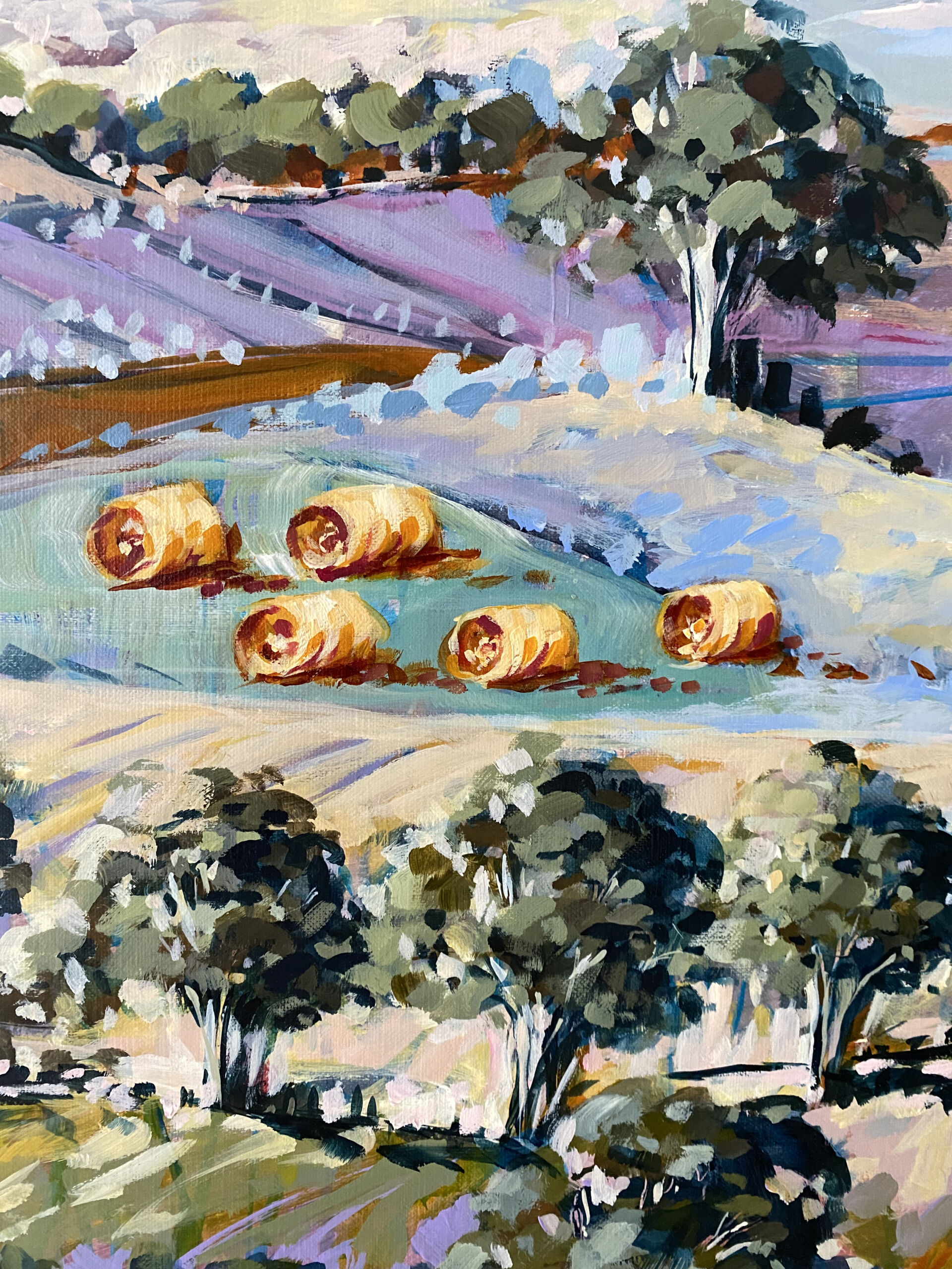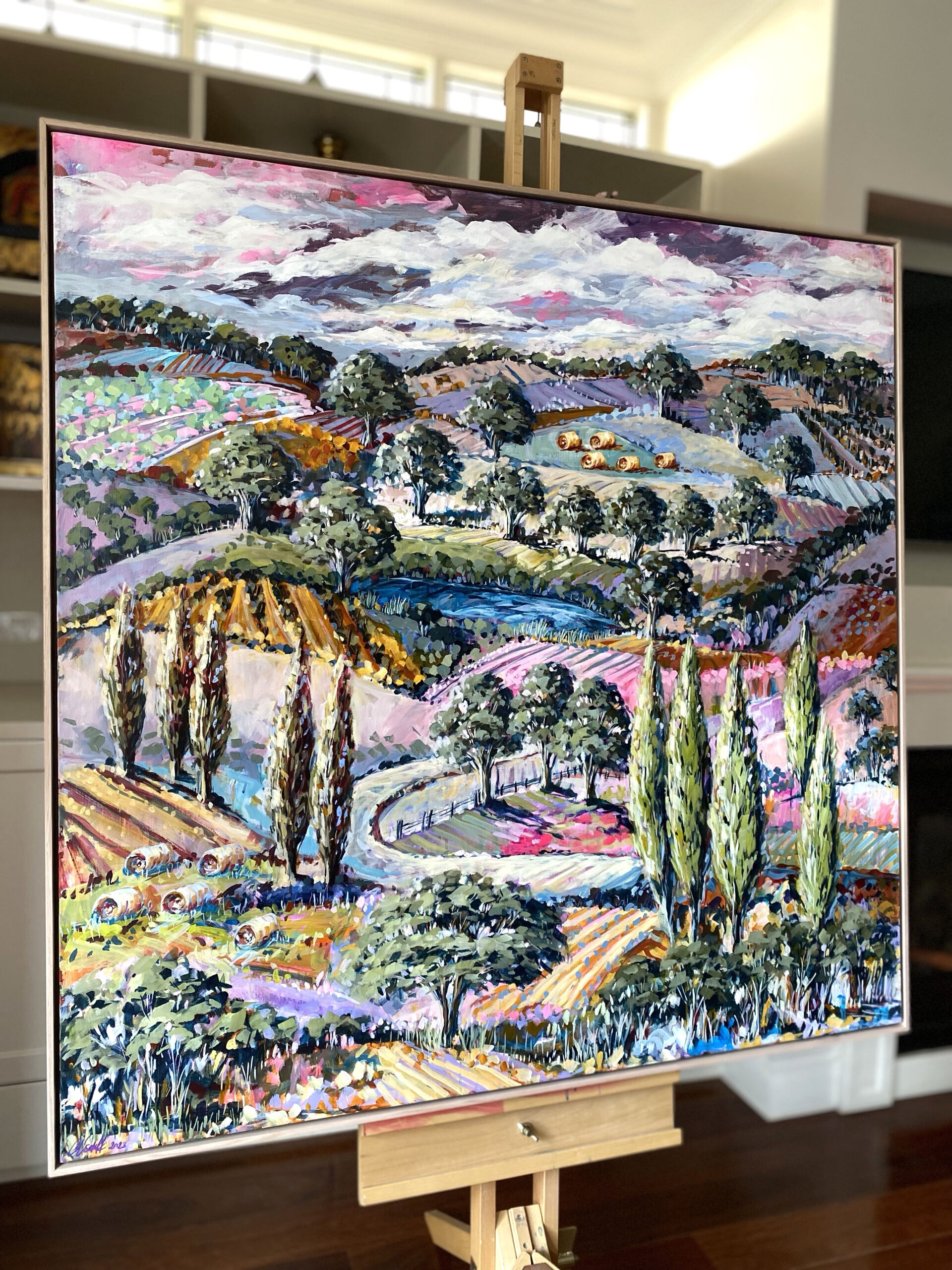 Inspired by the bountiful aspects of rural life and scenic hills and wineries on the Mornington Peninsula, this work invites you into the idyllic scene of rolling hills, scattered trees, hay bales and vineyards that stretch into the distance.