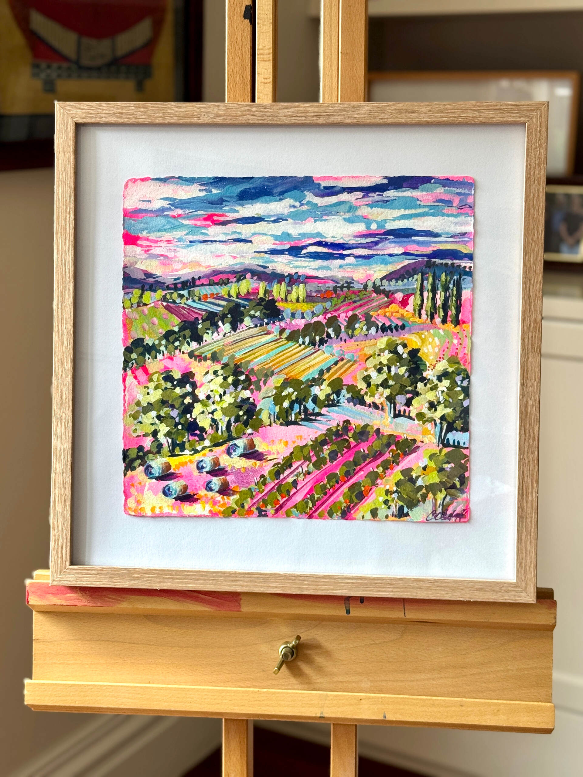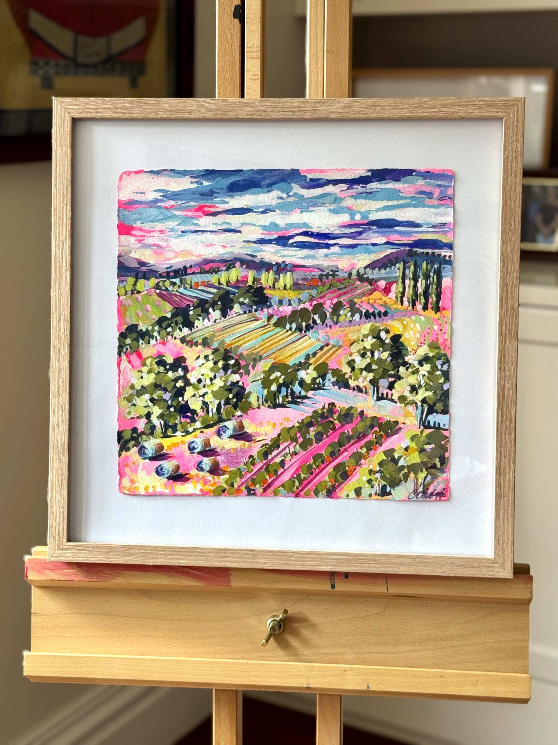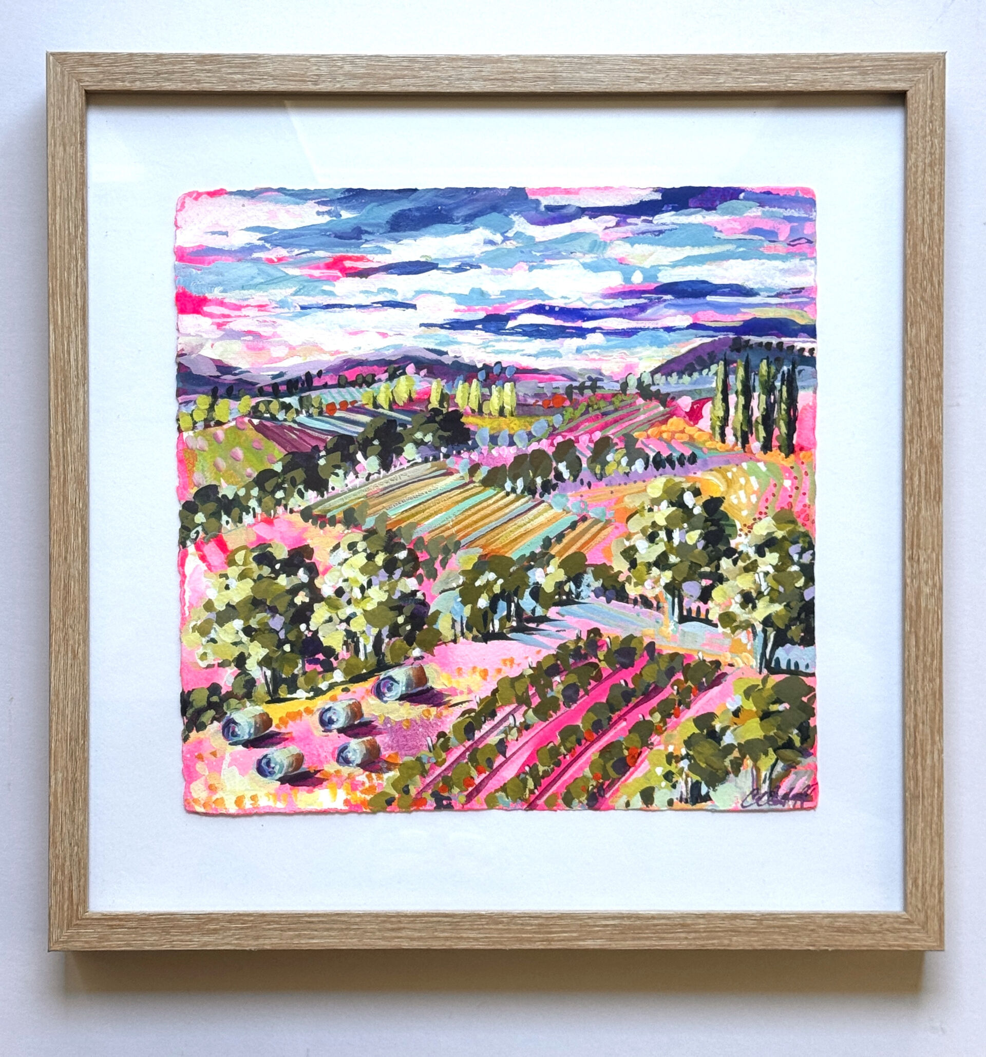 Pink Paddocks and Vines - gouache on watercolour paper by Cathy Usatoff