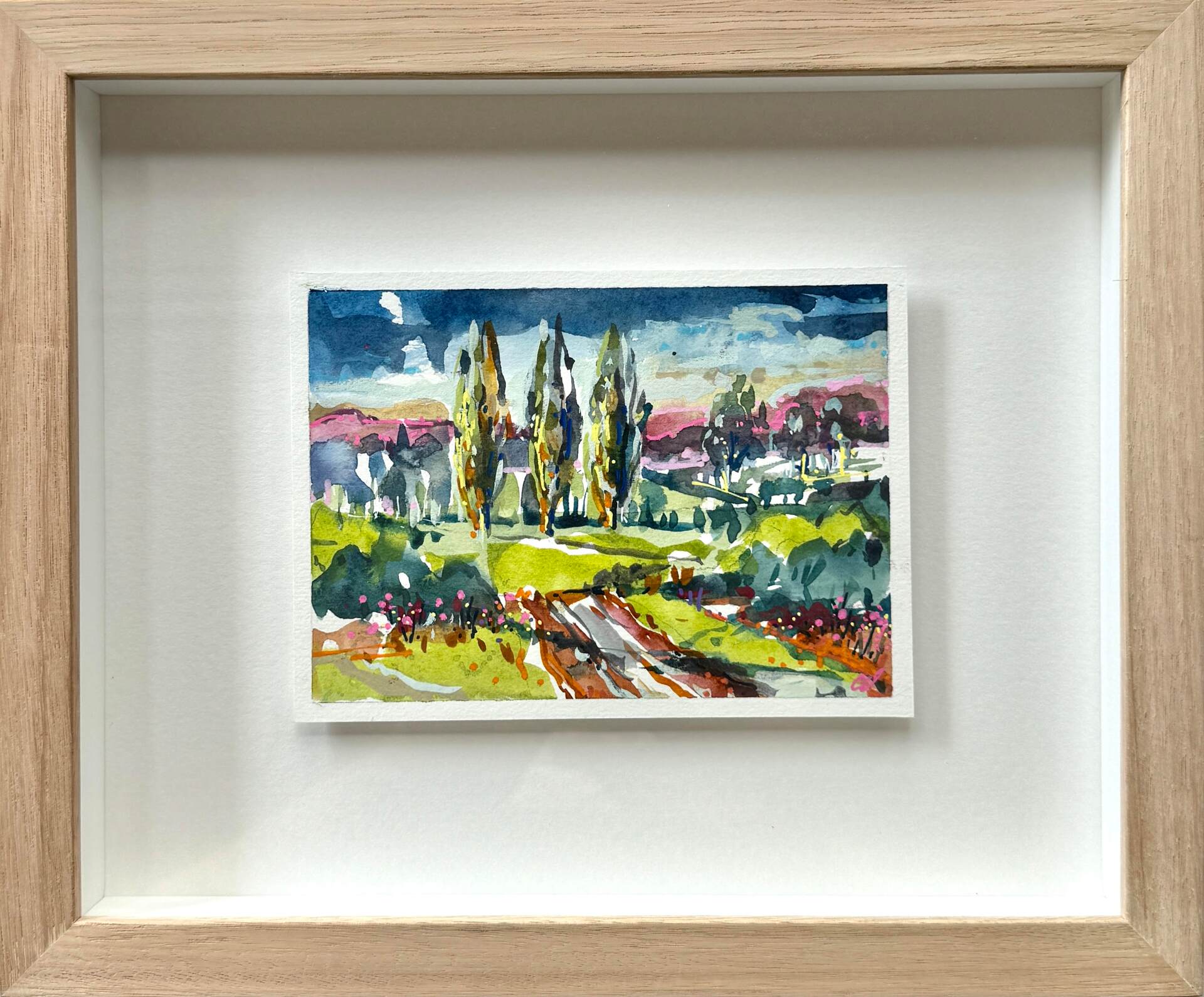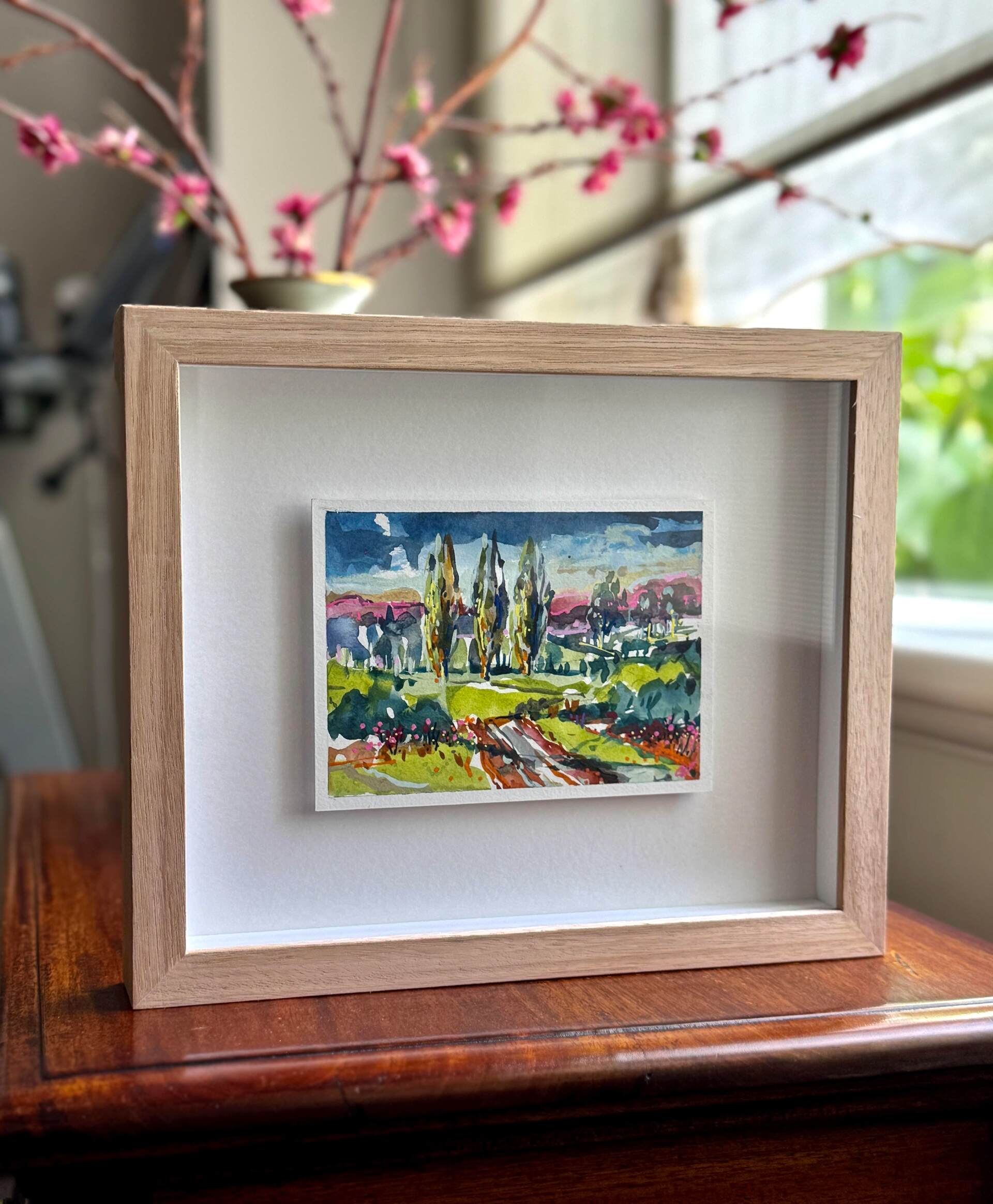 Small, intimate miniature watercolour study based on the Red Hill region on the Mornington Peninsula. Perfect for either a shelf or wall.