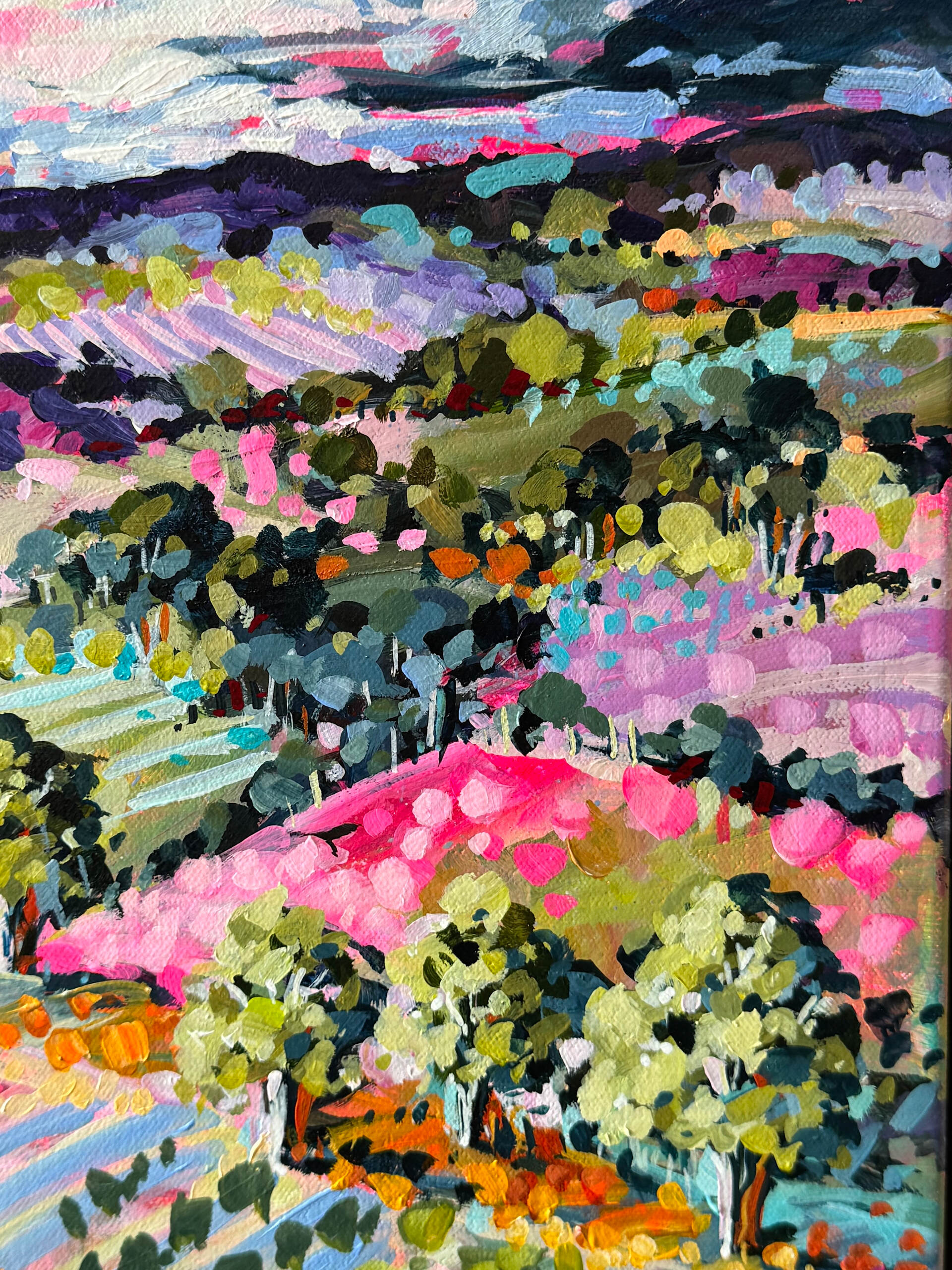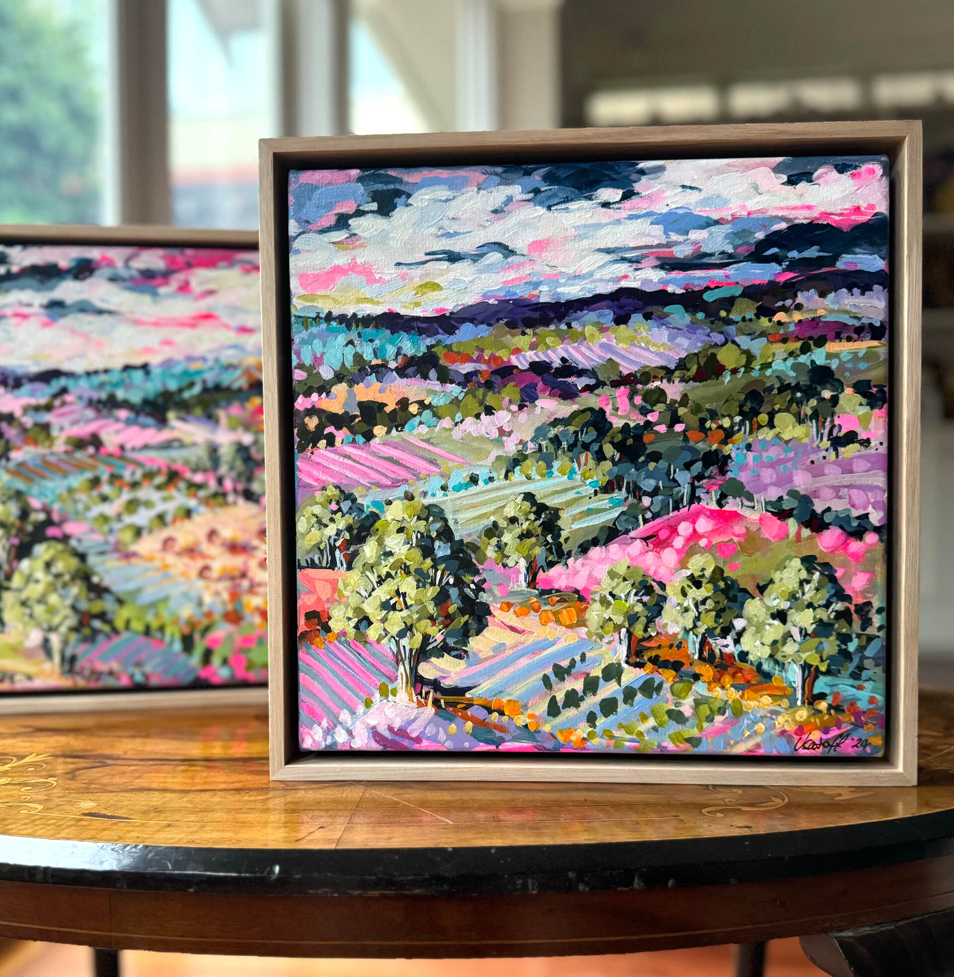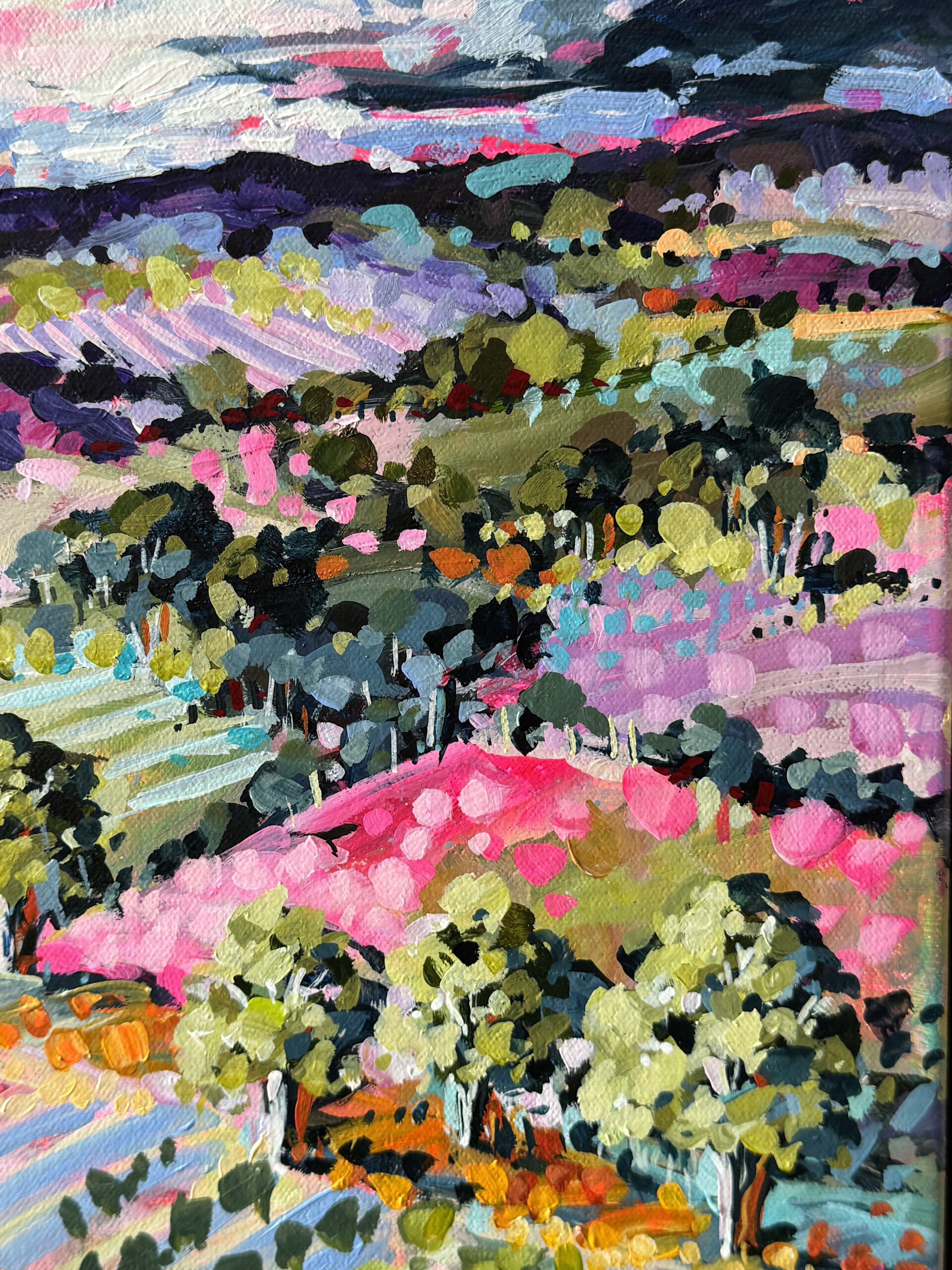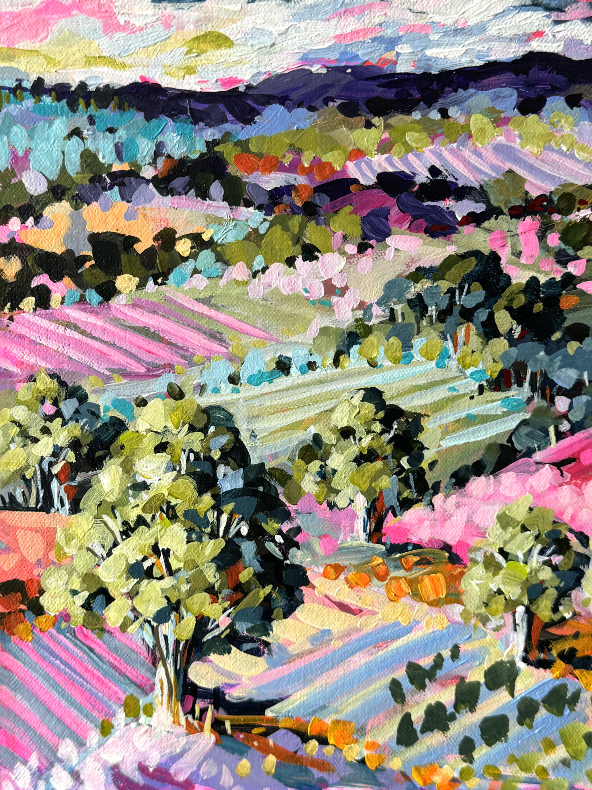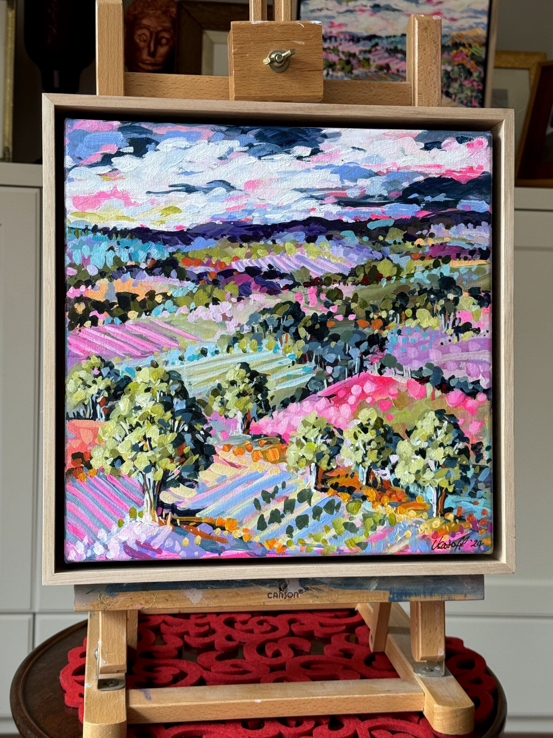 A delightful small work based on the Red Hill region on the Mornington Peninsular in Victoria. Can be hung on the wall or placed standing on a shelf or table.