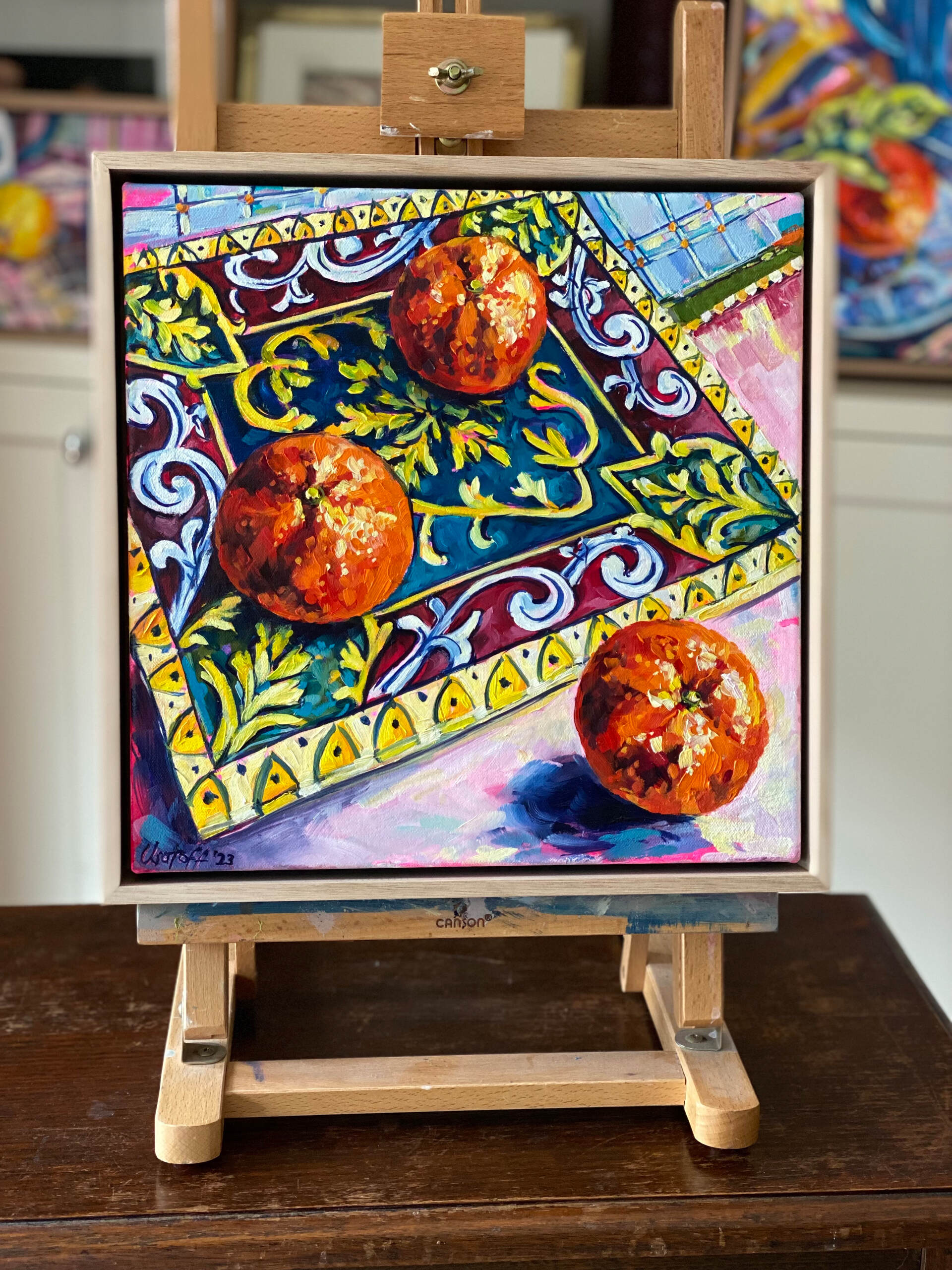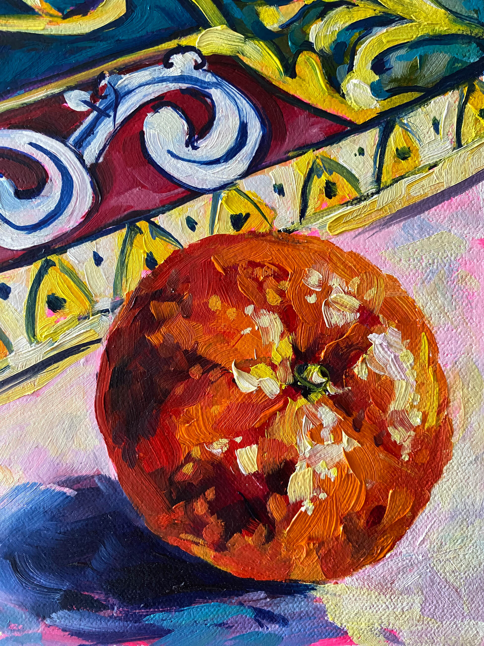 Three Mandarines oil on cotton canvas painting by artist Cathy Usatoff