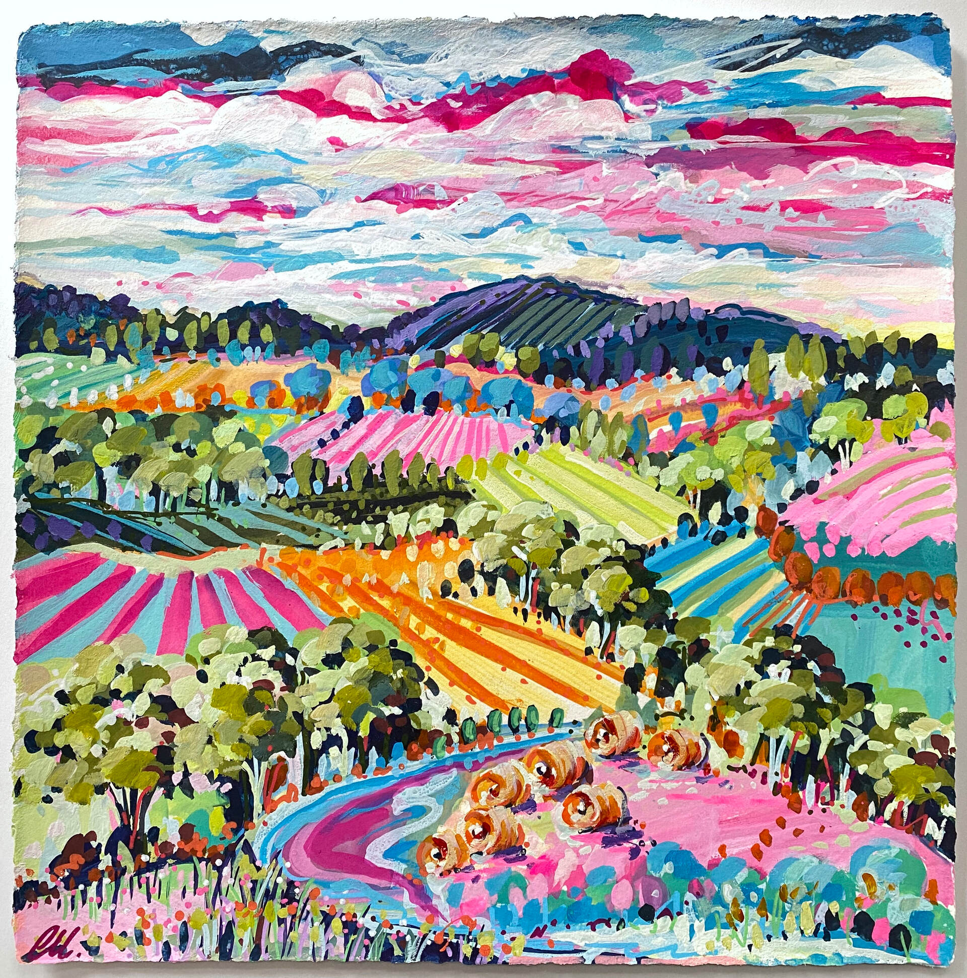 Vibrant Vineyards and Hay Bales SQ4 - Gouache on 300gsm paper by artist Cathy Usatoff