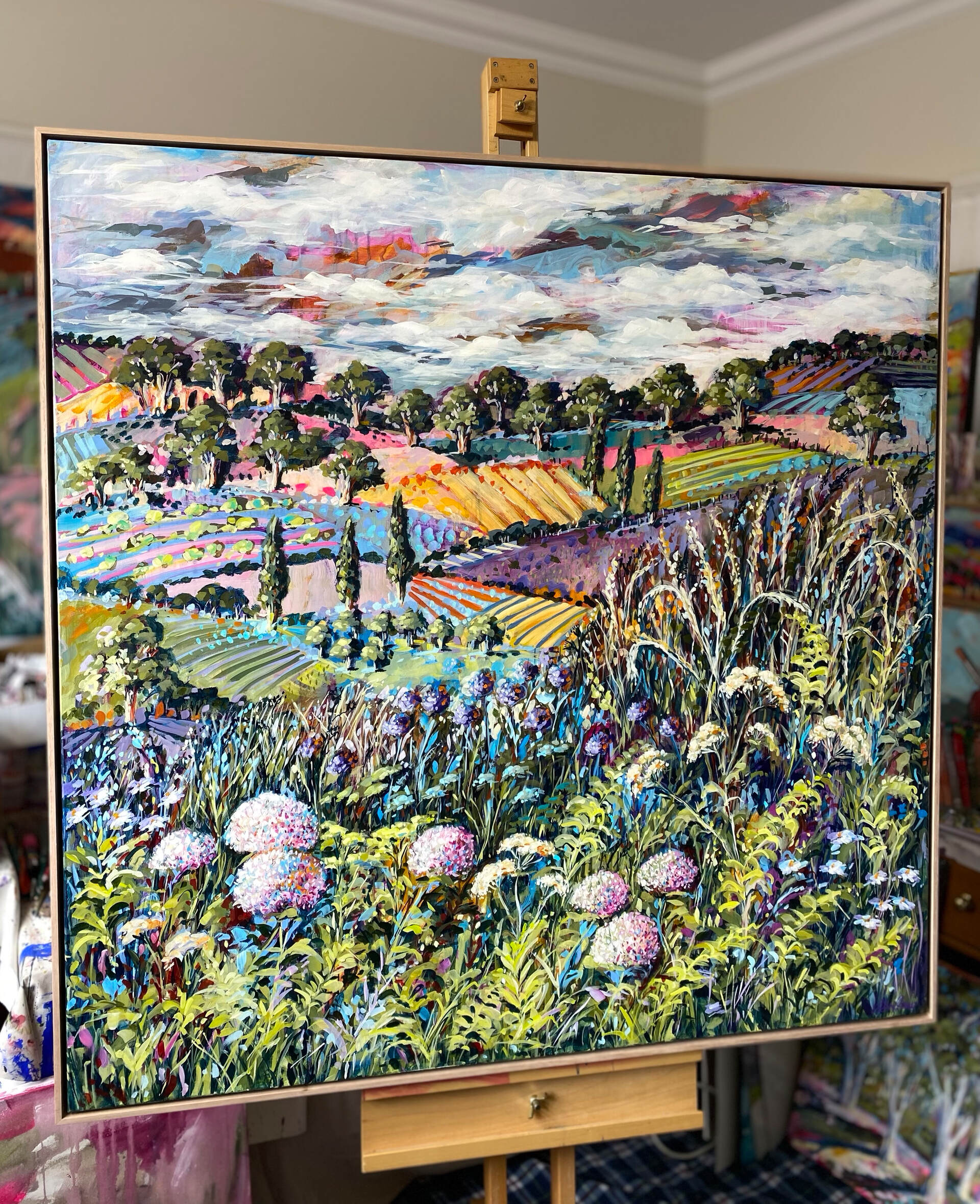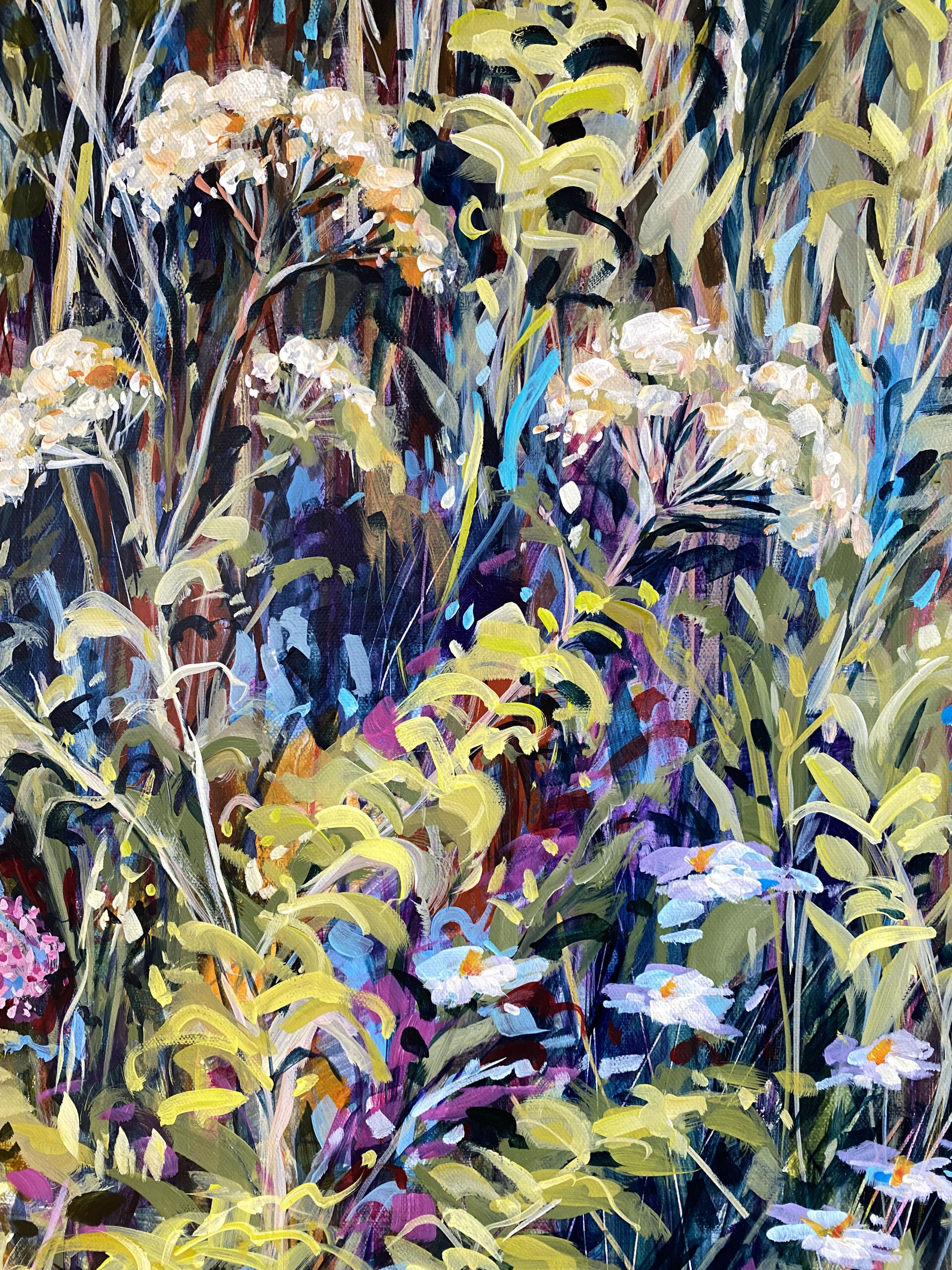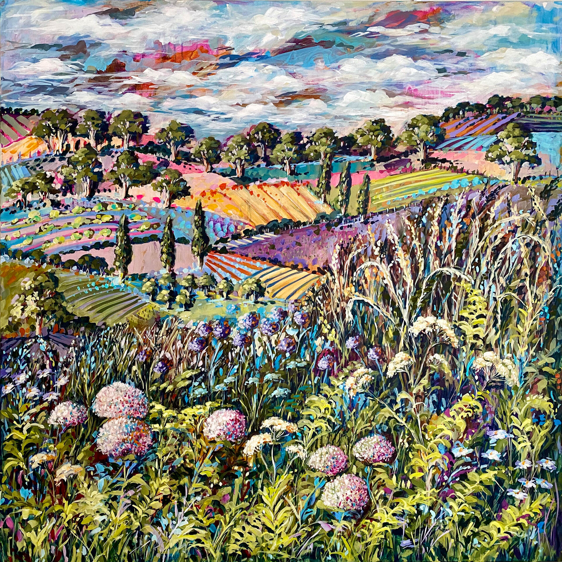 With distant hills as a backdrop, this work celebrates the untamed beauty, explosion of colours, textures and the array of wildflowers and grasses that are blooming abundantly across the canvas.