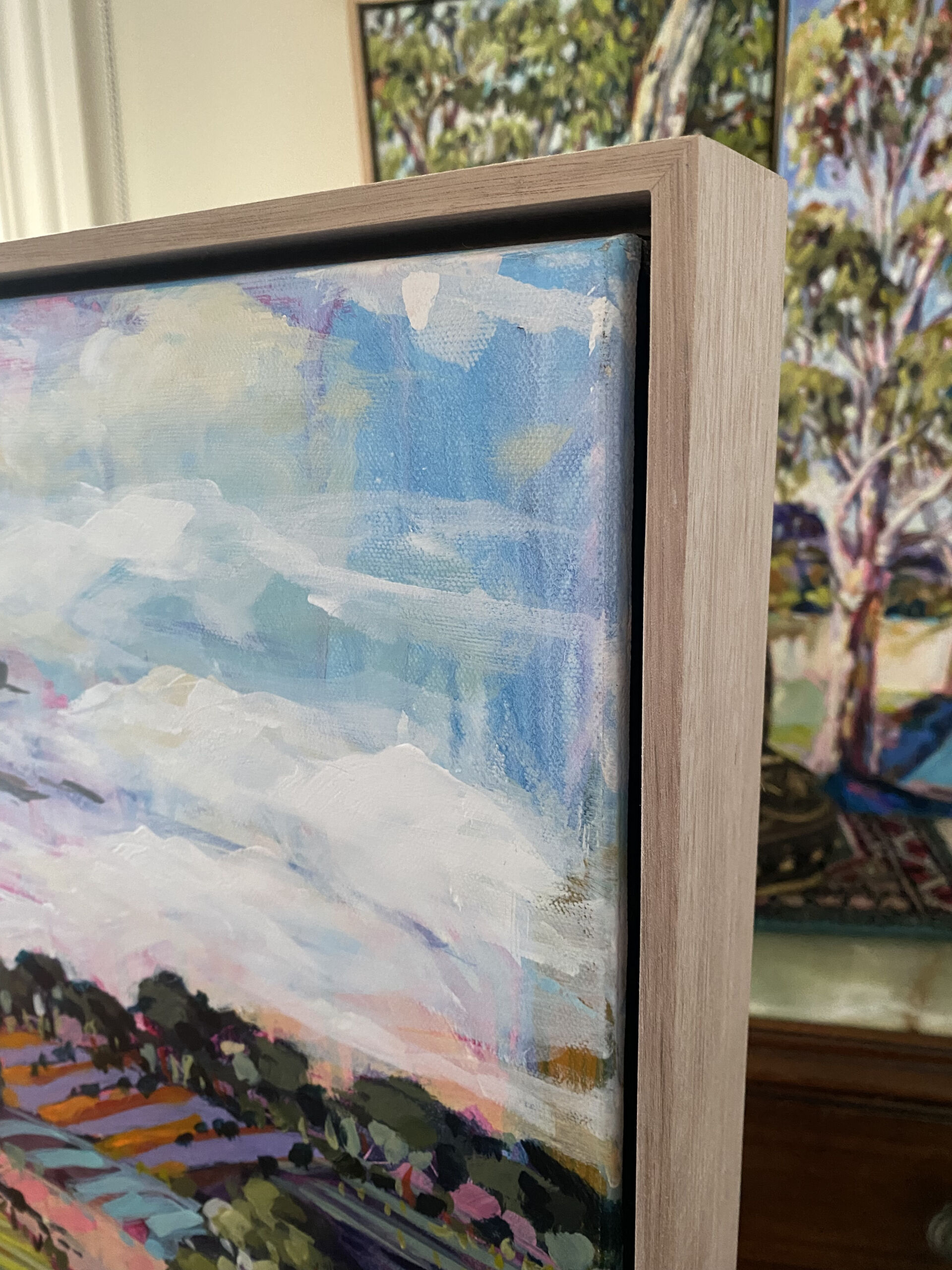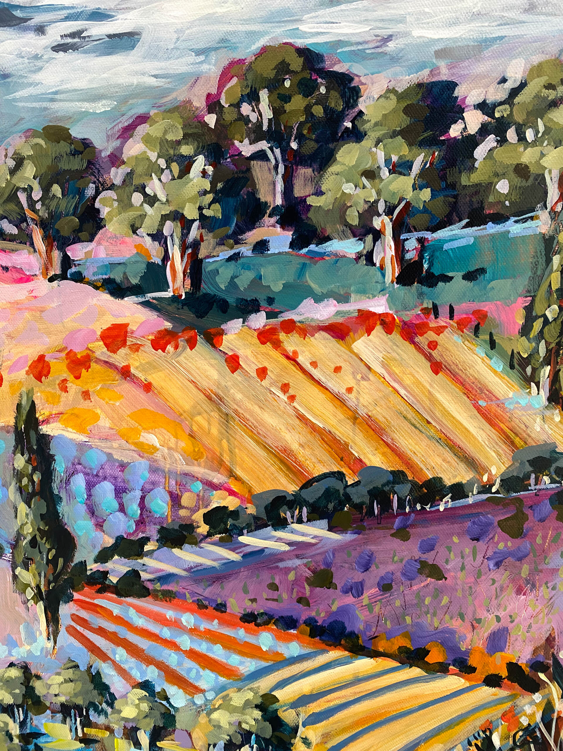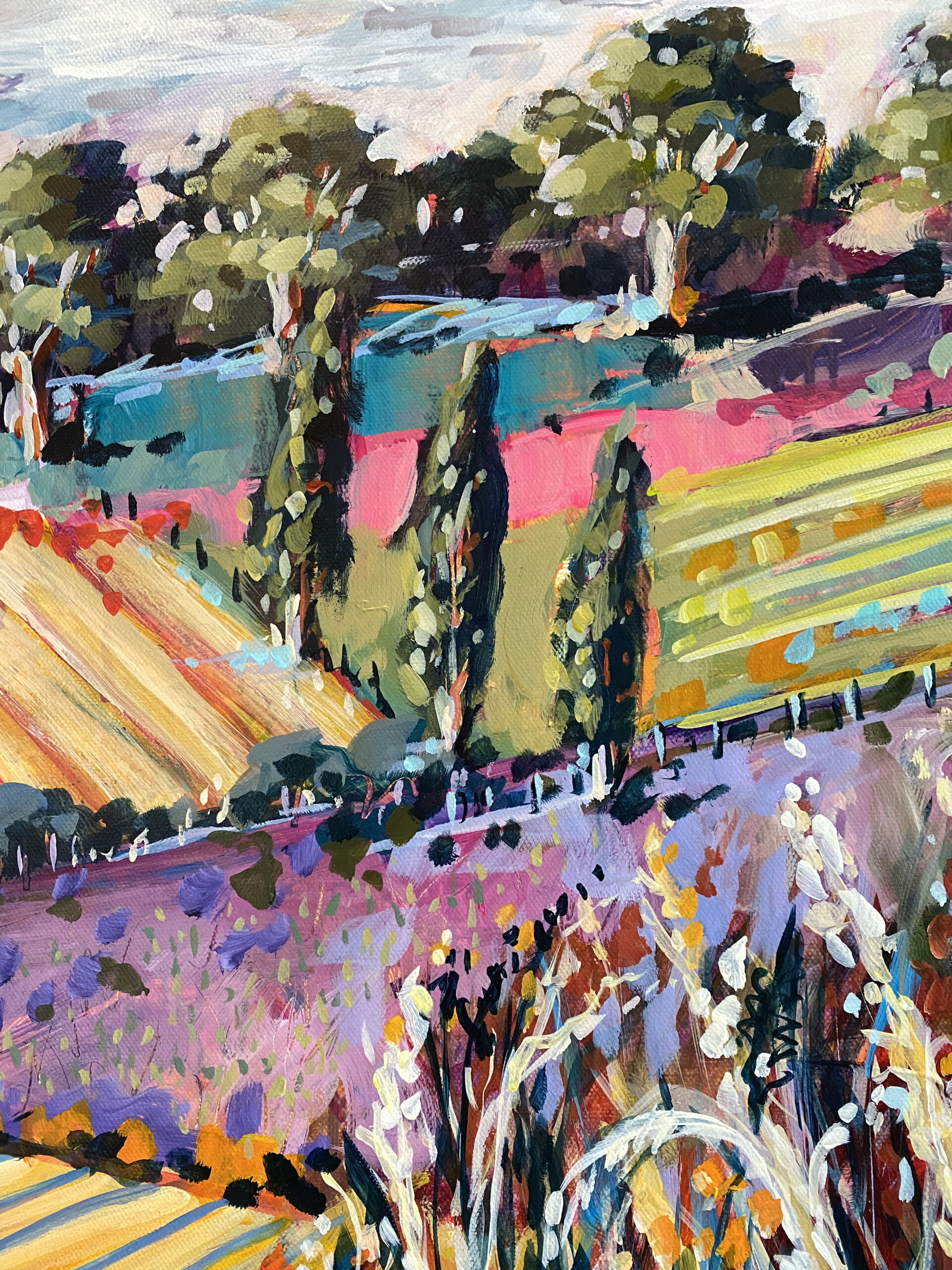 With distant hills as a backdrop, this work celebrates the untamed beauty, explosion of colours, textures and the array of wildflowers and grasses that are blooming abundantly across the canvas.
